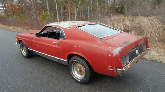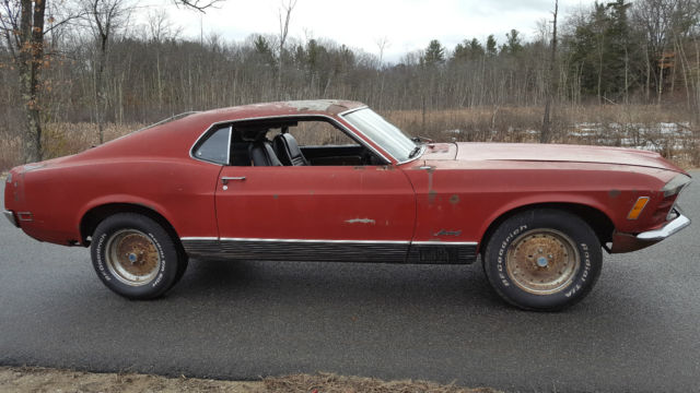 For sale not Trade and Please no Brokers 1970 MACh 1 real MACh 05 in vin Original 351 Cleveland 4bbl 4speed close Ratio manual shift Trans. This is a real find born in June of 1970 in Metuchen NJ sold Springfield MA June 20th 1970 was driven for 64000 in 17 years. She started to rust on the floor boards so was taken off the road and stored inside. Fast forward to 2016 found and purchasedstored outside one year untilnow. I have it stored inside with new brake parts factory front DISCs with power assist. New rebuilt Carburetor. I didn'ttrust the condition of the fuel tank so have been running it of a small Gerryjug in the engine bay. Has the original rear quarters. Needs floor work but the torque boxes and frame rails and front frames and firewall and rockers are all good. Just the floors and the body need the work. I believeIt has had only one repaint red over the original Medium Blue Metallic. The only body filler I can find anywhereis on the roof see the pics and videos (maybe something fell on it) Came with lots of great options especiallyfor a 70 Sport deck (fold down rear seat) full gauges with Tachometer in dash. Power Steering, power DISC brakes, front spoiler, rear wing, Black hood stripe,3.25 Traction- Lok Differential, and AM Radio Full Deluxe Marti report comes with the sale. The exhaust has some leaks. The power steeringcomponentsare missing (It's been converted to manual steering) AM radio is missing. So in conclusionI believethis is a real survivorwith its original 351 4bbl Cleveland V8 engine, Close Ratio four speed Manual trans, Traction-Lok 3.25 with full gaugesfold down rear seat, slats spoiler wing hood stripe NO AC I have describe this MACh to the best of my abilityIt is 47 years old and will need the restoration finished but is a very nicely optioned original MACh 1. International Buyers I would be happy to stuff your MACh 1 with all the parts you want to buy here in the States before shipping to you. Open and availablefor viewing before auction ends email for phone # to set it up a test drive .youtube video copy andhighlightand open link ... https://youtu.be/Ih9SFlOIXow .... ... https://youtu.be/KUNCMuRSm4s <><><><><><><><><><><><><><><><><><><><><><><><><><><><><><><><><><><><><><><><><><><><><><><><><><><><><><><><><><><><><>