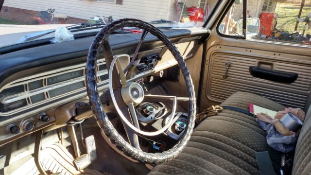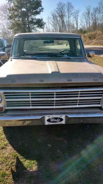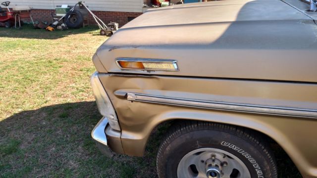 1969 FORD F-100 CUSTOM CAB, THIS TRUCK WAS REPAINTED SEVERAL YEARS AGO, MOTOR WAS FRESHENED UP AT THAT TIME, IT HAS A 240 6 CYLINDER 3 SPEED ON THE COLUMN, IT IS MY DAILY DRIVER WITH JUST OVER 100,000 MILES ON IT. TRUCK IS IN OVERALL GOOD SHAPE, CLEAR COAT IS PEELING ON TOP OF CAB. HOOD AND LEFT FENDER NEED TO BE REPLACED. I HAVE A FENDER THAT CAN GO WITH THE TRUCK. TRANSMISSION IS MAKING A NOISE BUT I AM GOING TO CHANGE THAT OUT IN THE NEXT FEW DAYS WITH A GOOD USED ONE. IT HAS THE USUAL DENTS AND DINGS AND SOME MINOR RUST IN THE CORNER OF THE DOORS BUT NOT TO BAD. THE MOTOR CRANKS AND RUNS GOOD, MINOR OIL LEAK AT THE DRAIN PLUG. BRAKES ARE GOOD, BUT ARE NOT POWER. HAS SOME PLAY IN THE STEERING, BUT AT 70 MILES AN HOUR SHE DRIVES GOOD. THIS IS A 45 YEAR OLD TRUCK AND THERE ARE SOME MINOR THINGS THAT NEED TO BE FIXED, BUT IT IS IN OVERALL GOOD SHAPE. IT DOES NEED A BLOWER SWITCH, IT WORKS BY A ADD ON SWITCH NOW. TRUCK COMES AS PICTURED, ANY QUESTIONS TEXT ME AT 828-429-6742