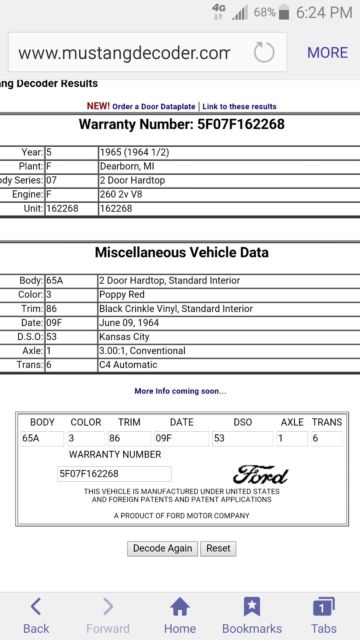 1964 Mustang 260 V8 Poppy Red w/AC