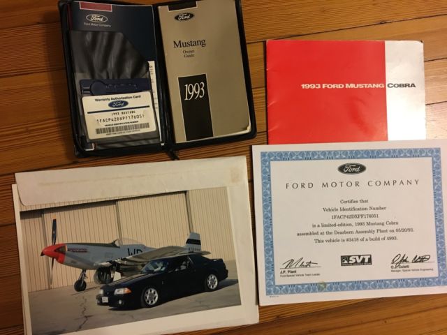 Well maintained 1993 Ford Mustang SVT Cobra with approximately 52,895 miles. SVT certificate, owners manual, Cobra brochures, service/maintenance guide/book, all modification documents, and service paperwork in-hand. Original headlights, stick shift, distributor, car cover, and extra parts included. ***Please no low offers. This is an authentic Cobra (Build # 3418) that is in very good condition and has not been abused. There are a few other Cobras on the market, which are in the mid and upper $20K's. Those around my price have over 90K miles on the clock.*** The modifications are listed below: | Manufacturer | Modification | | Performance | | Powerdyne | Supercharger Kit for '93 SVT Cobra | | BBK | Long-Tube Headers 1 5/8" - Ceramic Coated | | Ford Motorsport | 3.55:1 Gears, Ring, and Pinion | | Flowmaster | Force II Cat-Back Exhaust System with Stainless Steel Tips | | 5.0 Resto | Subframe Connectors | | MSD | Pro-Billet Performance Distributor | | Ford Performance | Hurst Short-Throw Shifter | | Anderson Ford Motorsports | Power Pipe | | 5.0 Resto | Lower Control Arms | | BBK | Off-Road X-Pipe 2 1/2" | | C&L | 76mm Mass Air Flow Sensor | | MSD | Boost Retard Control | | Special Service | Cooling Fan Clutch | | NAM | By-Pass Valve | | Walbro | 190 lph Fuel Pump | | Maximum Motorsports | K-Member Brace | | Kirban | Fuel Pressure Regulator | | Powerdyne | 11 psi Pulley | | Advance Auto Parts | K&N Universal Rubber Air Filter (RE-0920) | | MSD | TFI Performance Coil | | Ford Performance | Higher Performance 9mm Spark Plug Wires | | NGK | TR6 V-Power Spark Plugs (4177) | | Ford Motorsport | Chrome Oil Breather Cap | | Unknown | Fuel Rail Adapter for Electric Fuel Gauge | | Interior / Exterior | | JVC | Stereo | | Alarm System | | Phantom | 2 1/16" Electric Fuel Pressure Gauge | | American Muscle | Ultra Smoked Headlights | | 5.0 Resto | 140 mph White Face Dash Kit | | Phantom | 2 1/16" Air/Fuel Ratio Gauge | | Phantom | Triple 2 1/16" Full "A" Pillar Gauge Cage | | Phantom | 2 1/16" Boost Gauge | | Redline Tuning | QuickLIFT Rear Hatch Lift Cylinders | | Phantom | 2 1/16" Water Temperature Gauge | | American Muscle | 2 - Replacement Stainless Wiper Arms |