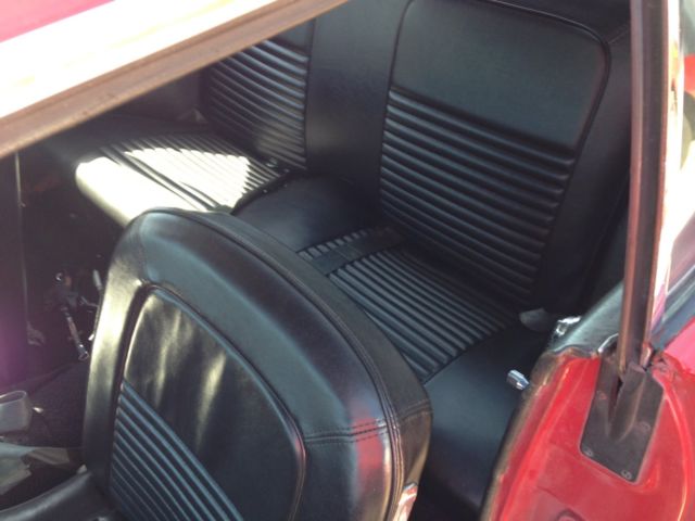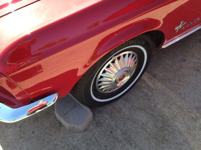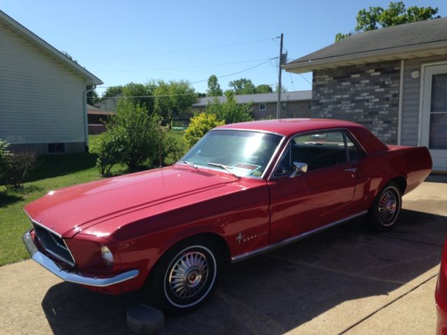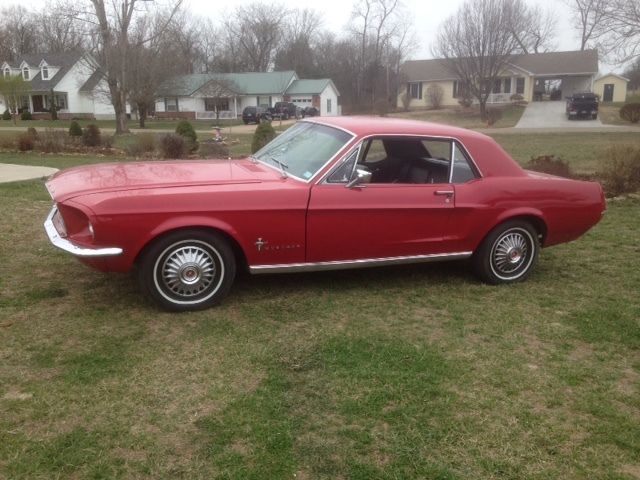 1967 Ford Mustang Base with Red Exterior and Black interior. Interior looks great with black seats and newer carpet. CD radio. Exterior looks good except for the hood need spots touched up and around back windows peeling a little. Trunk has one spot that needs fixed. New Carb, Electronic Distributor, plugs, wires, front shocks, front brake pads and springs. Tires on front are brand new 14" along with alignment. Back tires looks really good. 3 speed on the floor. Motor runs decent. Not a speed demon due to 200 straight 6 but it is a head turner. Front floor pans are rubber. Just passed local Missouri safety inspection. Mileage is unknown but I was told it had 104,000 on it. Will need brakes bleed and adjusteddue to soft brakes after front shoes was put on. Car is also for sale locally. |