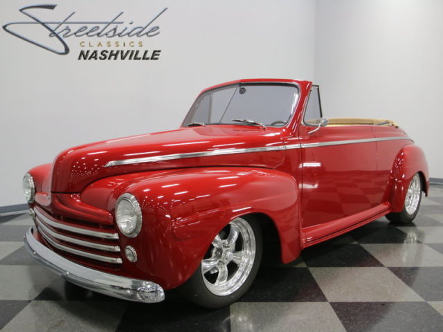 This is one of those full custom builds that instantly gets attention. After all, even its first impression gives away that this 1946 Ford Cabriolet expertly blends classic styling and modern performance. So while you love the iconic fat-fendered Ford silhouette; you'll really enjoy the ultra-slick red appearance, custom leather A/C interior, and LS1 V8 that give you all the best in modern convenience.The investment in this body reminds us instantly why we all love the rounded curves of the 1940s Fords. You know there was a lot that went into the bodywork before the paint even was laid down. That's why there not even a ripple in the 70+ year-old steel and the door fit like a seamless s part of the design. The modern red that's laid on top has that kind of quality clearcoat that really lets you appreciate every curve as the light rolls evenly across the entire body. Some of the brightwork was eliminated for the more modern appearance, but all the right elements are still in place for a great vintage look. After all, the bumpers shine like mirrors, and the three-bar grille is iconic. Plus, people won't be able to take their eye off the full-length trim that starts at the hood and runs as an unbroken line as it dips into the trunk. And even if people somehow thought this is just a factory Ford, the American Racing Torq Thrust wheels with aggressive 17/18-inch front/rear stagger would clue them in on this custom car's power.Pop the remote door openers to reveal a full custom interior by the masters at Paul Atkins Interiors. The amazing uniform build has the two-tone tan expertly weaving within the unique patterns on the seats, doors, and center console (it even matches the tan folding top.) It's this kind of presentation and investment that you know the interior can win awards all on its own. But more than just look great, this is a true driver's machine, too. Those leather bucket seats up front are vastly more comfortable than anything that came out of the 1940s. You'll slip behind the chrome three-spoke steering wheel, which gives you a clear view at the full Classics Instruments gauge package that look like their own works of art. Plus, you also get all the right features like power seats, power windows, tilt steering wheel, power steering, and an AM/FM stereo with aux input that's ready to accept your modern music players. Best of all, the modern R134a air conditioning is blowing ice-cold, so you can stay cool while cruising in your cool droptop.While you've seen plenty of custom work on the interior and exterior, the best is saved for under the hood. Peek beneath the custom body-colored panel, and you'll see a modern 5.7-liter LS1 V8. The fuel-injected powerplant borrowed from the C5 Corvette program is a serious power upgrade...and it's only the beginning of this Ford's performance components. When you look at the undercarriage photos, you'll also spot upgrades like the Mustang II-style independent front suspension, tubular control arms, and front disc brakes. So if you're starting to see this custom as an easy cruiser near or far, you'd be right. In fact, it even has a modern four-speed automatic transmission with highway-friendly overdrive.You've looking at a full custom build that is just as adept at taking home all the awards as it is staying cool on the morning commute. It's the true classic that can do it all, and with only 810 miles on this build, why wouldn't you? Something this special won't stay long in our showroom. Call today!!!