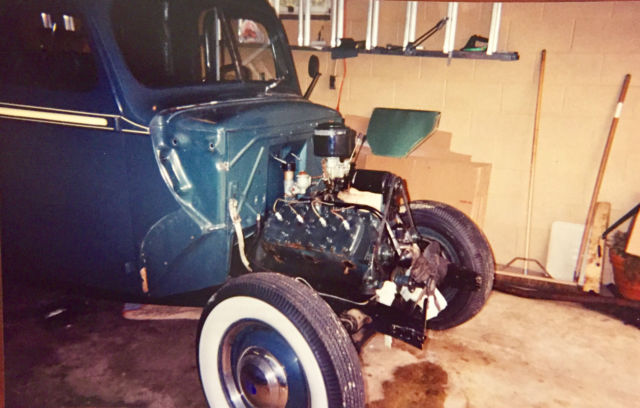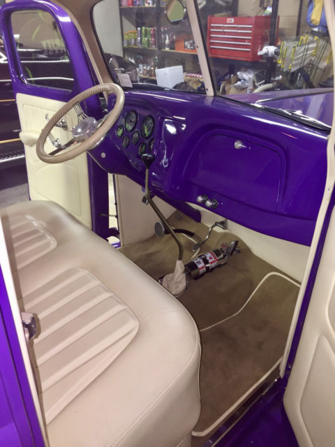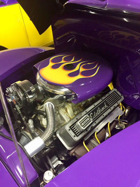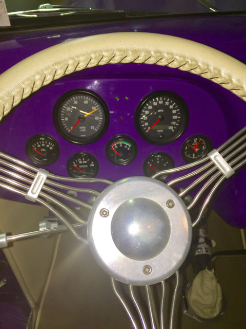 The flathead ford was replaced for a tried and true 383 Chevy complete with Corvette heads, Sanderson headers, 4 barrel carb, and a mild street cam. This powerhouse was mated to a 3 speed automatic controlled by an authentic Gennie Shifter. A bullet-proof 9 inch Ford rear-end resides out back to put the power down.