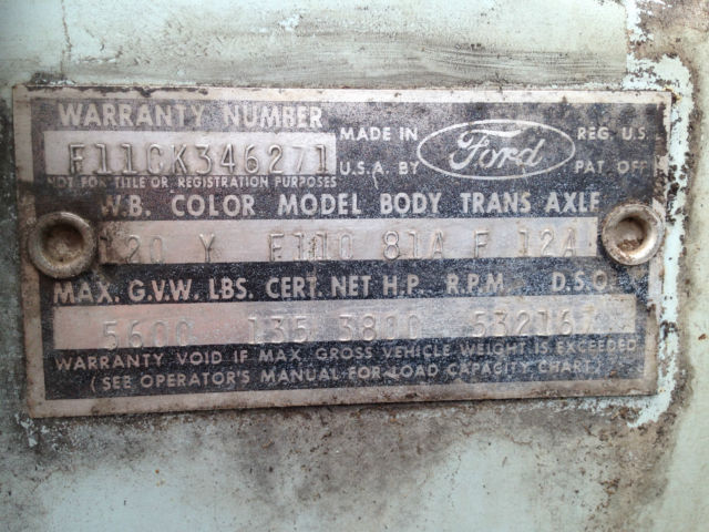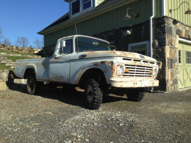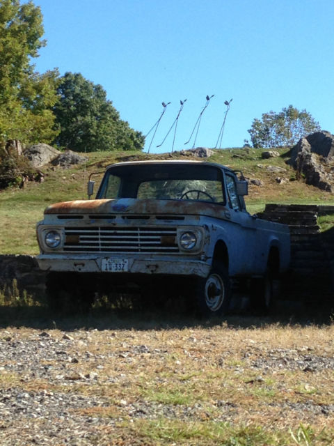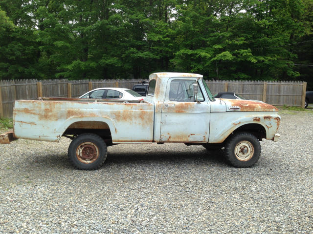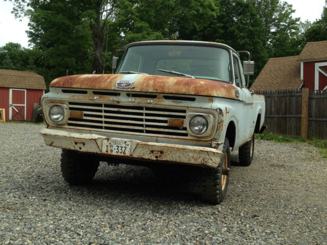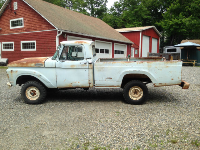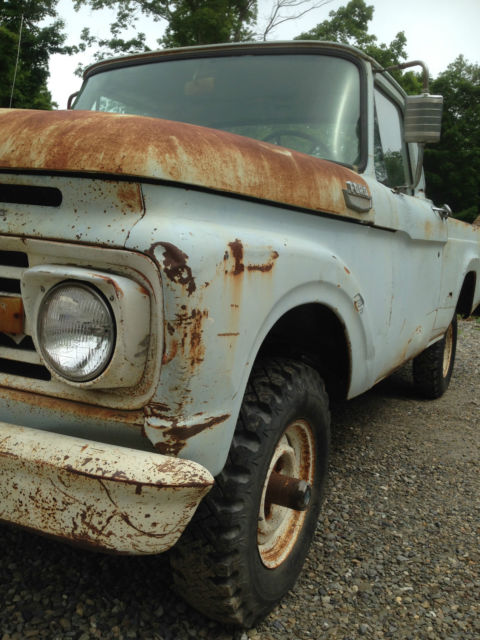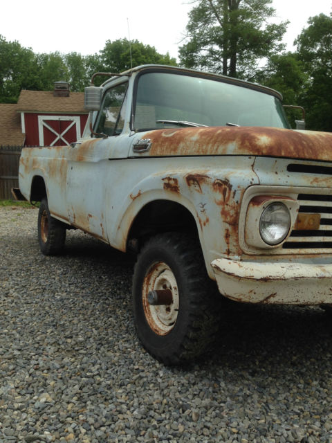 | All original 1963 Ford F100 with a rebuilt and replaced 292 Y block from a 1957 Mercury. Valve covers even have the embossed Mercury logo. Truck is solid and 4WD works. Only light surface rust through on small section of hood and portions of bed. Cab corners, bottoms of the doors, frame, floor and fenders are solid. Has a rebuilt starter, new solonoid and battery. The truck runs well and is completely driveable. Can arrange and coordinate shipping. |