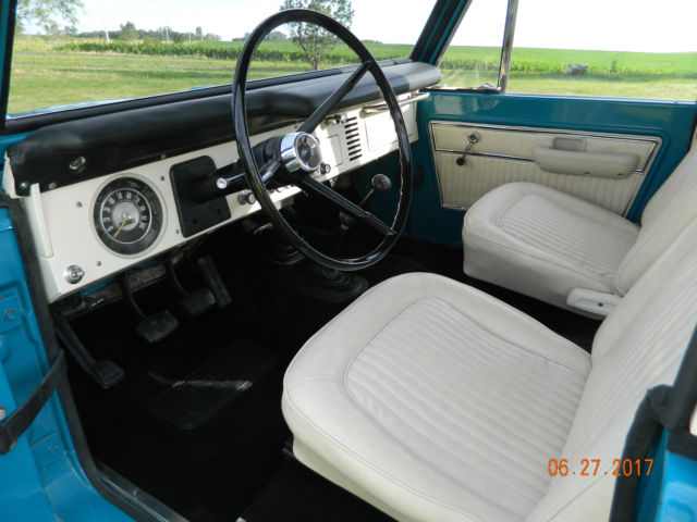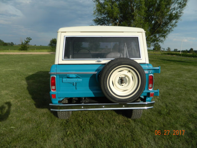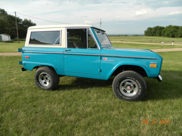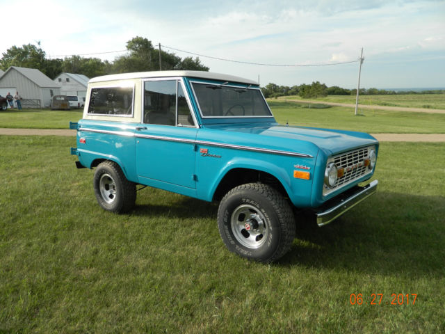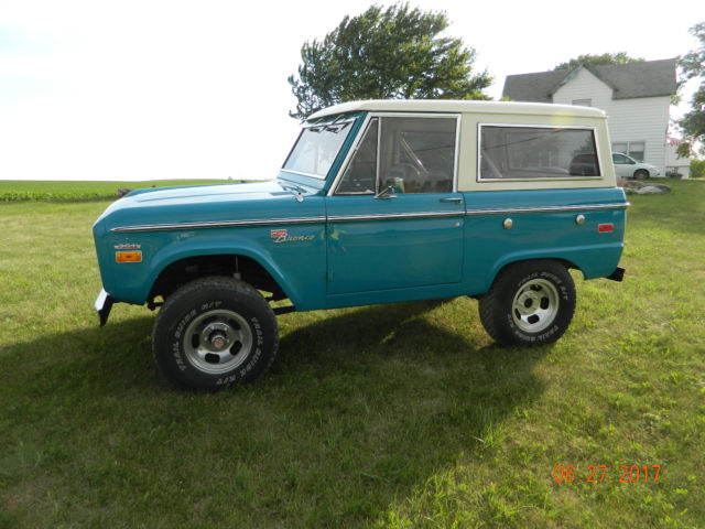 You are bidding on a 1970 Ford Bronco that just underwent a 2 year frame on restoration. This bronco is equipped with a 351 cleveland with 2500 miles on a rebuild. It has an Edelbrock intake and carb and a recent tune-up. The following new parts are under the hood as well: Voltage regulator, fuel pump, gaskets in engine, alternator, water pump, thermostat, battery, shroud, belts and headlights. Not yet installed, but will include a new 2 1/4 dual exhaust with turbo mufflers. It has a 4 speed manual new process transmission a Dana 30 front axle and a ford 9" original rear axle. Transfer case is the original Dana 20. Rims are polished slots with new lug nuts and sitting on 31x10.50x 15 tires. Tires are about 80%, and has a 3" body lift. Now for the best part. The body was done with Valspar paint to the original codes, with 3 coats of base and three coats of clear. This Bronco looks awesome! When the body was restored both front door posts were replaced along with new inner and outer rocker panels. A new front floor pan was installed on the drivers side, partial pan on passenger side. Lower qtr panels on both side were replaced and a new hood installed. Rest of body is original and was in excellent shape before the restoration, very little filler was used in this entire body. A new chrome grille was installed and new 351 badges and gas caps. Other badging and lettering and trim is original and in excellent condition. As for the interior all of the original seats were recovered and the rest of the interior is new. It retains its original dash pad and it is in excellent condition. Instrument panel is original to vehicle, all gauges work, however, radio is not hooked up. During restoration all glass and door seals were installed. Window channels and gate seals are also new. All new smoked laminated glass was installed as well. For more information call 605-670-9433 Jay |
