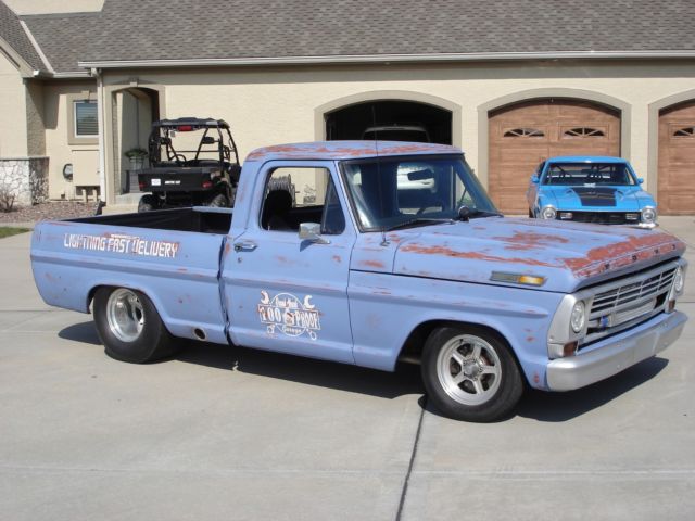1969 Ford F150 Shortbed. TWIN TURBO!!! Lowered suspension and narrowed rear end. This truck has an expensive paint job to give it the patina Moonshine theme look. SUPER COOL AND SUPER FAST!!! It's draws tons of attention at car shows and people are blown away when they look under the hood. TWIN TURBO 398 strokersmall block Ford. 351 Windsor block with aluminum heads and 57mm turbos with intercooler. Steel crank. Forged pistons. ARP stud bolts. Roller rockers. Turbo custom Comp Cam camshaft. Victor Jr aluminum intake. Demon 850 Turbo Blow Thru carburetor. MSD ignition. Aeromotive Fuel System. Built C6 transmission with 2,400 stall converter. Ford 9 inch traction lock rear end with 4:30 gears. Four wheel disc brakes. Updated independent front suspension with rack and pinion steering. Body is great condition for almost 50 years old. Autometer gauges. Truck smokes the rear tires easily and an extra set of rear tires comes with it. With the age of the vehicle, the mileage is likely over 100k. Please feel free to call and or email with any questions. Thank you, Chris 816.590.7660. |