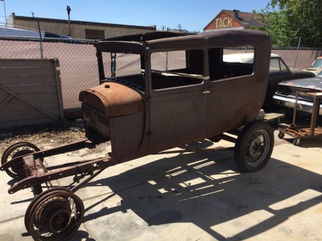 | 1929 model A ford 2 door sedan. Roller stock front and rearend. No engine no transmission but has 4 16" wheels and 1 19". Dash front window frame and other parts. Body has some dents and a few Bullet holes but no rust. Again no rust though. Only surface rust. Will help to load. i has a clear nevada title in my name. sorry i looked on the title and it's a 1929. |