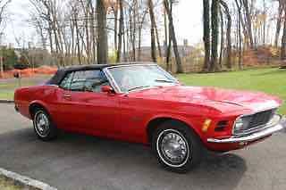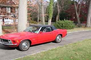 | 1970 Red Convertible Ford Mustang. two door with Black leather interior. In good condition. runs well with only 43. 05 miles. Tiny rip in the top and regular wear and tear. |