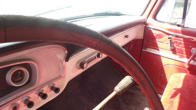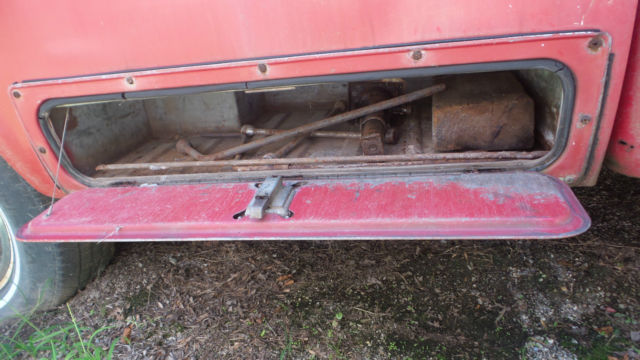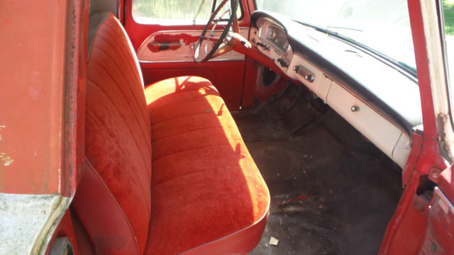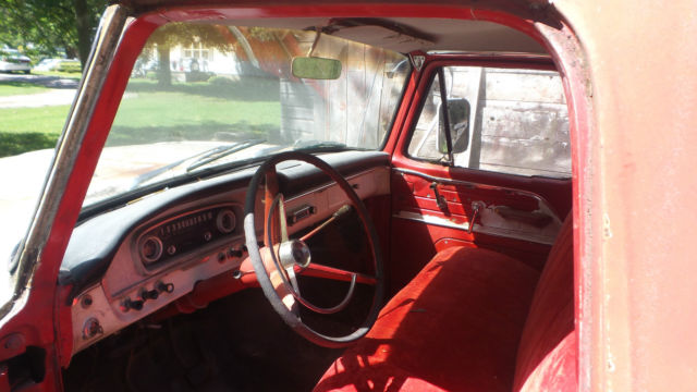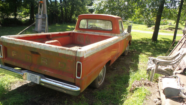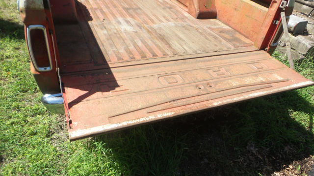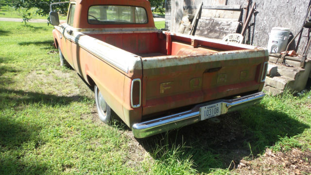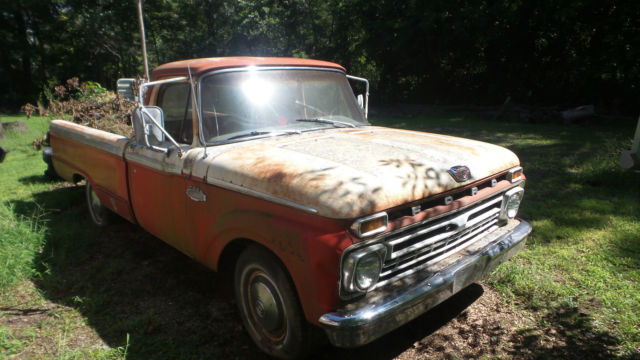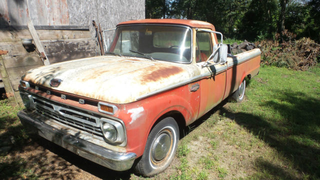 I have a classic 1966 Ford pickup with a V-8(not sure on size) and three speed on the tree transmission. This has a original red and white paint job on itwith a Custom Cab.I don't see any bumps or bruises on body panels, but there are normal scratches and what appears to be surface rust in places(Patina). One small piece of chrome is off on right side in front of door, but that piece is in the glove box. Thewheel lug wrench and jack is still in the side tool box. The windshield is cracked on right side, but rest of the glass appears to be OK. I have three extra wheels and extra ford hub caps as seen in pictures that will go with it. The steering wheel has cracks around the spokes, the vinyl door inserts have deteriorated, and the speedometer says 77966 on it. Don't see any thing rusted out in the bed or fenders.It don't have a battery and has not been started in a couple years, but I can still turn motor by hand(Not froze up, No water in oil). I bought for a project at the time, but just don't have time to do anything with it. Pickup sold as is and where it sits available for you to ship or pickup after paid for in full. Request $500.00 by PayPal within 24 hours(Non Refundable) of auction close. I will accept Cash at time of pickup or send me a check 5 days(Bank Clearance) prior to pickup. If you have questions let me know.On Aug-27-17 at 18:13:13 PDT, seller added the following information: After a bidders question I have discovered that the cross support that runs under the seat has some decay(approx. 10 inches) on both ends.