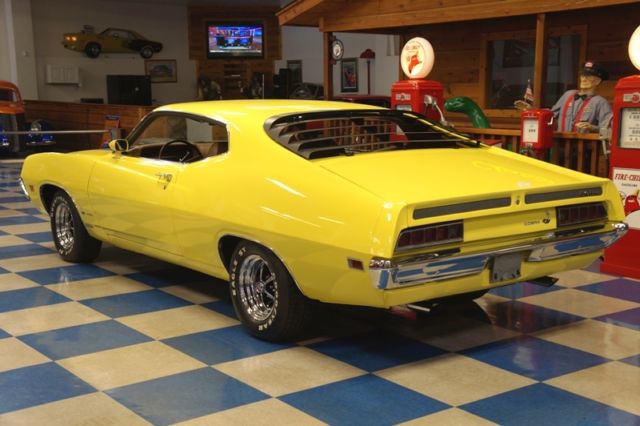 429 cui / 370 HP engine (casting# D0VE A / Partial Block VIN stamp# 142231). C 6 Automatic column shift transmission (PJC A – ’70 429 CJ/SCJ Torino). Ford 9” with 3.25 Traction Lok rear axle. Painted factory Bright Yellow with Blackout hood (code D). Factory Medium Ginger Spectrum Stripe Broadcloth / Vinyl bench seat interior (code PF). Power front disc brakes. Power steering. Edelbrock intake. Dual exhaust with headers. Factory Tachometer. Factory Rim Blow steering wheel. Color keyed racing mirrors. Shaker hood. Rear Sport slats. 14” Magnum 500 wheels. Comes with Marti Report showing this car to be 1 of 6 with Paint / Trim codes. Factory J code Ford Torino Cobra 429 – 4V CJ Ram Air. Call 830-468-6479 for more information on this or any 1970 Ford Torino for sale in our inventory. Own a hard to find Real Deal Torino Cobra 429 for $52,900 429 cui / 370 HP engine (code D0VE A) C 6 Automatic column shift transmission Ford 9” w/ 3.25 Traction Lok rear axle Painted factory Bright Yellow w/ Blackout hood (code D) Factory Medium Ginger Spectrum Stripe Broadcloth / Vinyl bench seat interior (code PF) Power front disc brakes Power steering Edelbrock intake Dual exhaust with headers Factory Tachometer Factory Rim Blow steering wheel Color keyed racing mirrors Shaker hood Rear Sport slats 14” Magnum 500 wheels Marti Report showing this car to be 1 of 6 w/ Paint / Trim codes Factory J code Ford Torino Cobra 429 – 4V CJ Ram Air This vehicle has been inspected by an A&E Classic Cars and includes additional services.