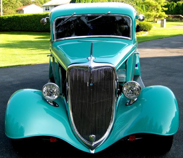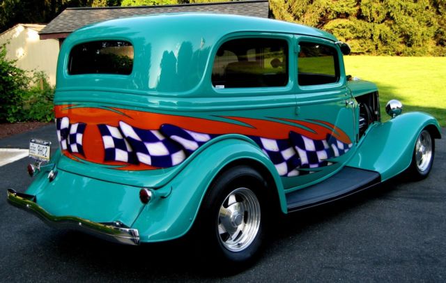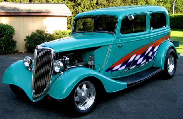 1934 FORD RARE TUDOR SEDAN, STUNNING RESTO-ROD CUSTOM BUILT STREET-ROD LOW MILES SINCE COMPLETION, FRESH 350 CHEVY V-8, TURBO 400 AUTO TRANS, NEW AC-HEAT-DEF, CUSTOM 2 STAGE JADE PAINT W/CUSTOM GRAPHICS, CUSTOM INTERIOR, HEIDTS SUPER RIDE FRONT SUSPENSION W/PS, PW, CENTECH WIRING, CHROME TILT, PL, ULTRA POLISHED ALUM WHEELS, CORVETTE POSI-REAR W/3.73 GEARS, 4 WHEEL POWER DISC BRAKES, TRI-BAR HALOGENS, ELECTRIC WIPERS, CLASSIC GAUGES, BRONZE TINT, ROOTLIEB 4 PC STEEL HOOD, LOKAR SHIFTER, E-BRAKE, WALKER RAD, FLOW MASTERS, CUSTOM SONY CD STEREO, RECEIPT FOLDER BRA & COVER INCLUDED, GARAGED SINCE COMPLETION, EXCELLENT. You are bidding on a stunning 1934 Ford Tudor Sedan 2 Door V-8 with a Custom Street Resto-Rod restoration completed. With its current retired owner for nearly 20 years a fortune invested in parts, materials and untold man hours to transform this 34' Ford into a modern dream one-off Street Rod. It is loaded with options including a fresh Chevy 350 V-8, Turbo 400 auto transmission with Lokar Shifter, Corvette Posi-Rear, Fiberglass TRW Mono-leaf rear spring, Air Conditioning and Heat, Power 4 wheel disc brakes, Heidt's Super Ride front-end with power steering, front PW, Power Locks. Drop-dead gorgeous up close and personal. The time and effort that went into this Ford is evident throughout in the quality of workmanship, parts, and materials used during the build. Its performance is excellent and will not disappoint its new owner. If you have been searching for a 1934 Ford Tudor Sedan with all the right options here are more details.