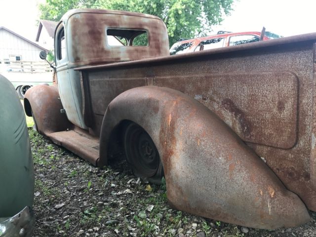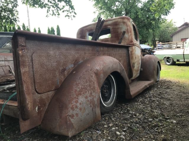 Last chance before it gets stored before the winter! 1941 Ford pickup has no motor or trans. Does have title! Front is set up with tubular A arms, adjustable coilovers and rack and pinion steering. Disk brakes up front, drum in rear. Does not have steering column or pedal. Cab was all smoothed out and any holes were welded and grinded down firewall. Rear has a mocked up ford 9in with ladder bars. Have a bunch of little parts for it, seat in rough shape, tailgate, heater core, new master cylinder, shocks, springs, gas tank, window tracks, window trim. Truck was sand blasted but unfortunately sat outside but still very very solid with minor surface rust and no rust holes! Has no cab floor due to having to make a transmission tunnel also has no box floor. Great start for someone's project. Any questions or more pictures and walk around video shoot me any email at jknudson2103@hotmail.com. Do accept paypal and Will ship truck on buyers expense and total amount due within 3 days after auction