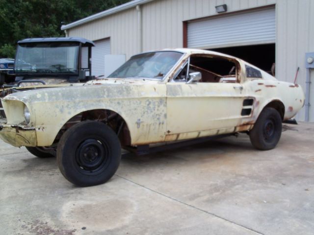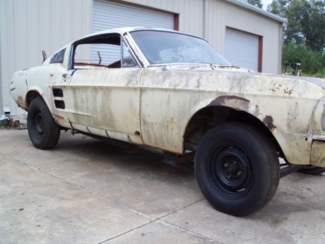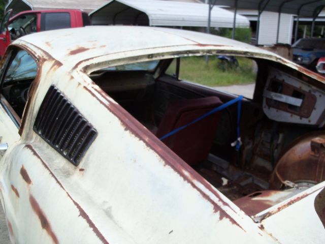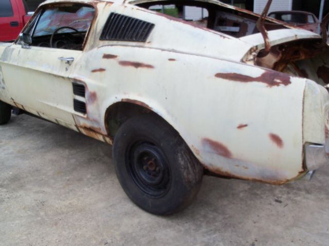 Needs a complete restoration. Hasn't been on the road since the early seventy's. Wasn't wrecked justparted out. They cut the left front frame rail and shock tower off and used on another car. It will need a front clip. Iput 2x2 tubing under it to get it to roll for shipping. The quarters are original rust on bottoms. Top is in decent shape no bondo.Rear frame rails are good. No engine, trans or rear center section. All the fastback's glass is missing except windshield its broken. Most of the interior is missing. What you see in the pictures is all that comes with it. Sold with bill of sale and current registration from a non title state. NO TITLE. The vin is stamped on the right apron and it has door tag, I will assistloading. If you have a feedback score of 10 or less your bid will be canceled unless you contact me first. Email or call James @ 803-943-8369.