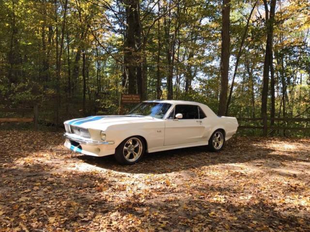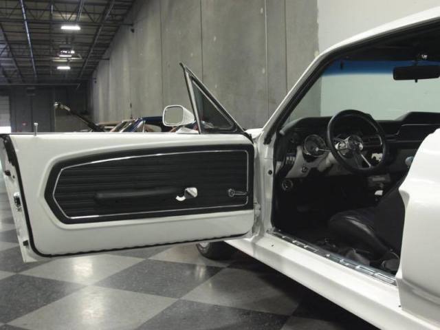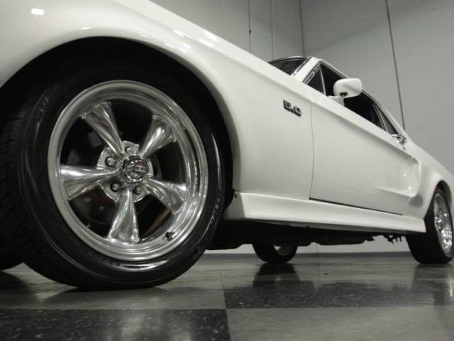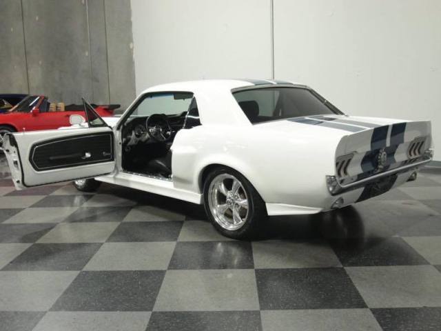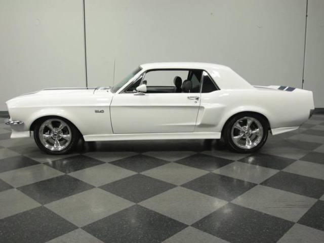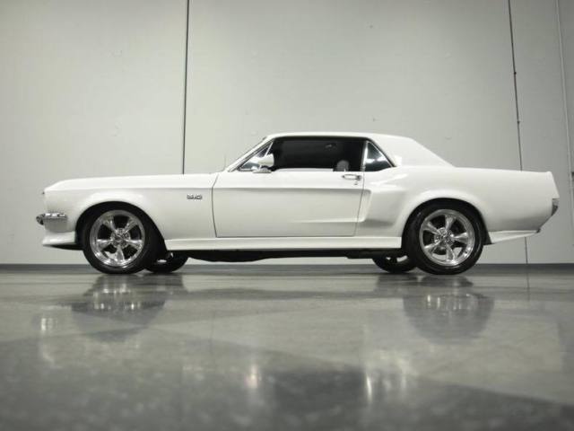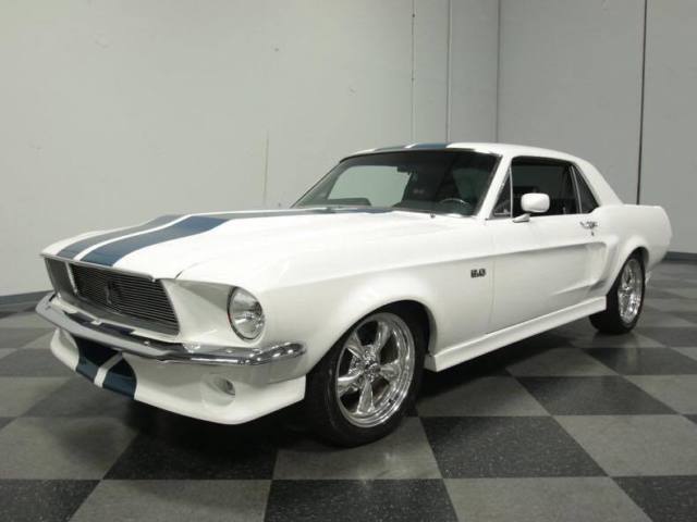 PROBUILT PONY RESTOMOD, 5.0 FI V8, T5 T-SPEED, 4-DISCS, SERPENTINE, R134A A/C!! This pro-built Pro-Touring 1968 Ford Mustang coupe has every trick you could want under its glowing white skin. Trading on a Shelby-esque look, it packs serious firepower in the form of an injected small block, a highly functional interior, and a reworked suspension that'll keep it tight with some pretty serious hardware. Sometimes you know a car is right from the start, and this is one of those cars. With bright white paint and traditional Guardsman Blue stripes, it will certainly stand out anywhere it goes, but it also nails the stance and adds a few custom details that will make necks snap back for a second look. Shelby-style details include a billet grille, faired-in scoops on the quarter panels, and the glassed-in ducktail spoiler out back looks especially trick when combined with body-colored Mustang taillights. Of course, it goes without saying that the bodywork underneath is very nicely done and the paint has been buffed to a brilliant shine that shows off the vivid red finish to great effect. There's a slight dome in the hood that's a bit reminiscent of the Eleanor Mustangs, plus a deep chin spoiler that's a cool change from the usual stuff. Fresh chrome bumpers add some contrast, and all the little details that make Mustangs so beloved are still intact, including the 5.0 emblems and Shelby-style gas cap out back You'll be absolutely blown away by the upgrades inside. Deeply bolstered buckets from Procar have been upholstered in black leather with 5.0 embroidery on the headrests, and the rear bench has been finished to match. The stock door panels look especially slick with their brushed aluminum inserts, which go great with the dashboard full of Dakota Digital gauges. A stock steering column and a billet 3-spoke steering wheel make it easy to get comfortable, and your hand will naturally fall on the custom shifter for the 5-speed manual gearbox. A custom center console adds cup holders and a more performance-oriented look, and a Pioneer AM/FM/Bluetooth stereo with speakers scattered throughout the interior. In back, the trunk is neatly finished with black carpets, so it looks tidy and professional without adding any weight. But the hardware is the real star of this show. The engine is a fuel-injected 5.0 from a 1991 Mustang that's been rebuilt and fortified for combat. Up top there's an Edelbrock intake manifold that any 5.0 fan will recognize instantly, as well as a bunch of chrome and polished aluminum dress-up. A big Griffin aluminum radiator keeps the hot small block cool, and there's a custom serpentine belt setup for the polished accessories up front. The T5 5-speed manual transmission was rebuilt at the same time as the engine and gives this vintage pony a very up-to-date feel. With upgrades like a coil-over front suspension, tubular control arms, and rack-and-pinion steering, handling is exceptional. Four-wheel discs provide all the stopping power you'll need, and with block-hugging headers and Flowmasters, you'll have no problems getting attention. The rear end is an 8.8 out of a Ford Explorer (hence the rear-wheel discs) and it sits on 17-inch REV wheels with fresh performance radials. |