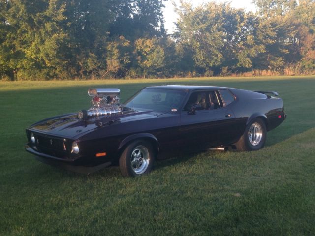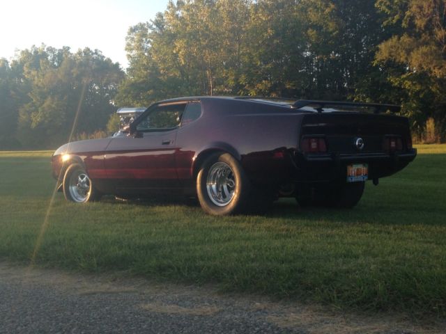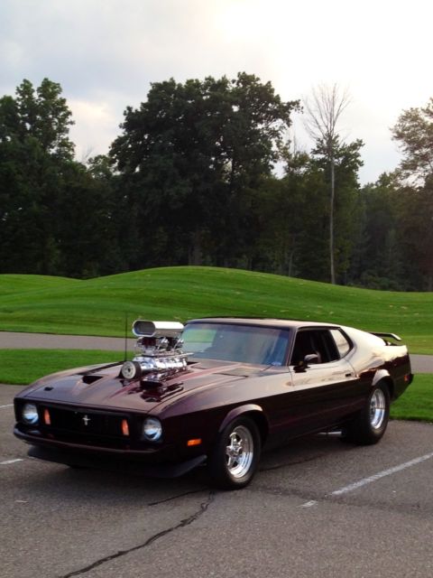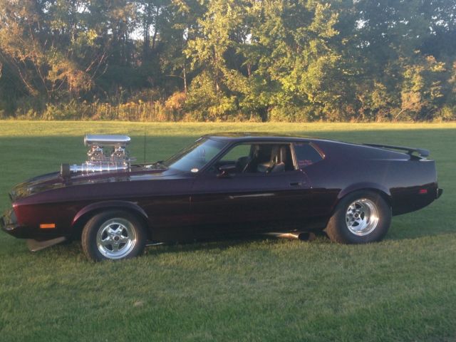 1973 Pro Street Mustang Mach1, 514 ci forged stroker crank, 45 cc diamond dish pistons, eagle rods, super cobra jet aluminum heads, Hampton 671 blower with two holly 750 double pumper carburetors p/s and 4 wheel disk power brakes, be cool aluminum radiato, 12 gallon fuel cell,1500 miles on motor, Reverse valve body C6 transmission that was rebuilt two years ago, Ford 9 inch with the 391 gear, ladder bar suspension with coil over koni shocks, 31x16.5 x15 rear Mickey Thompson radial, front tires to match tread on rear tires with weld wheel aluminum rims, flow master exhaust, interior of car is pretty much stock with door panels and dashboard and full gauges, all the lights,turn signals,brake lights work, I drive the car on the street and it gets a lot of attention wherever it goes, The color of the car is brandy wine and runs great 248-379-0730 if need more information on car. Owned car for 20 years and time to move on to something different!
