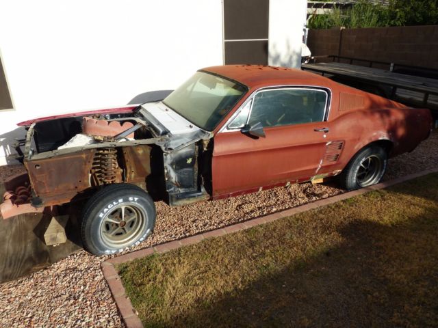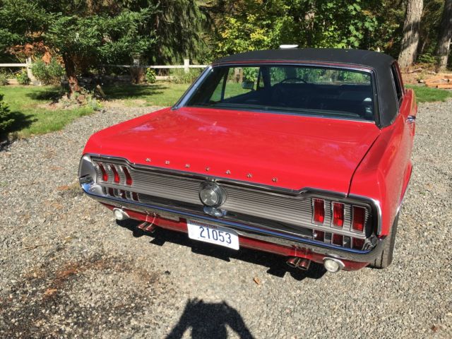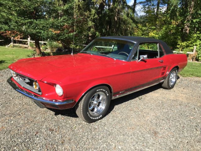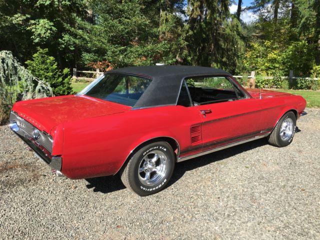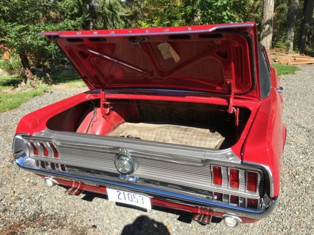 - 1967 Ford Mustang GTA s-code, 390 with c-6 automatic, numbers matching! I bought this car from my step dad who bought it from the original owners family. The car was originaly bought in Bothell, Washington. I have all orginal paper work for the car including; window sticker, owners card, contract, etc. The motor and tranny have been rebuilt along with most of the running gear. Power steering all rebuilt, brakes, calipers, rotors, shocks, aluminum radiator, new rims and tires. Has been painted original candy apple red and the lower back panel grille painted the correct gun metal gray. Still has all factory tinted glass, new carpet, headliner, vinyl top and the rest is original. I have new seat materials and door panels that goes with the car (I liked the original stuff) Here are some of the options that the car came with. (I have deluxe Marti report)