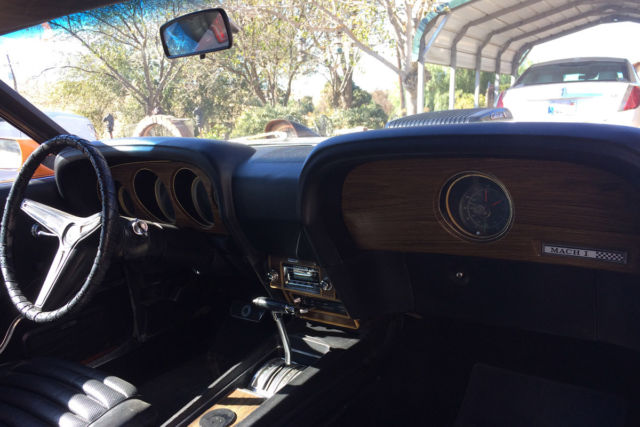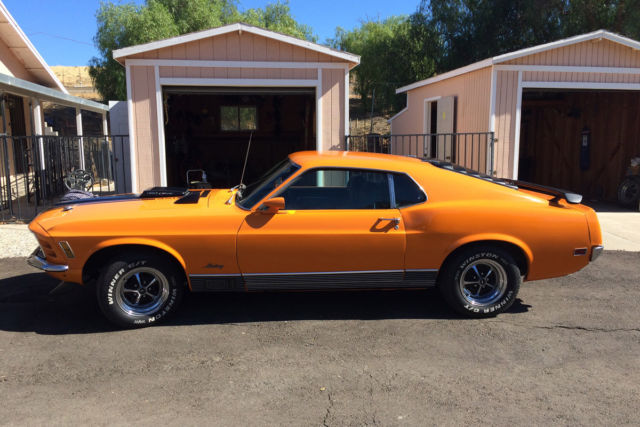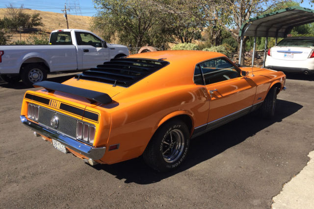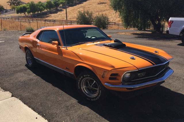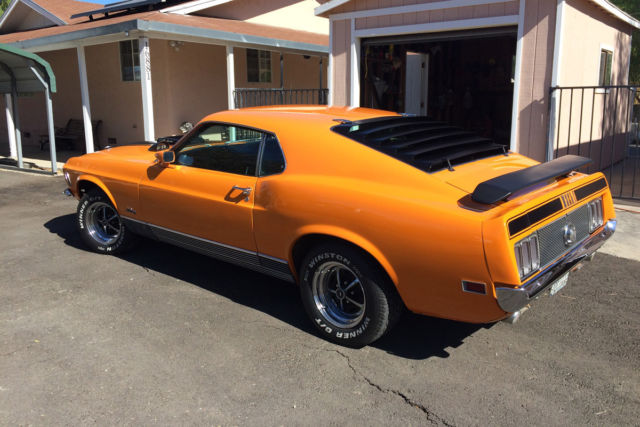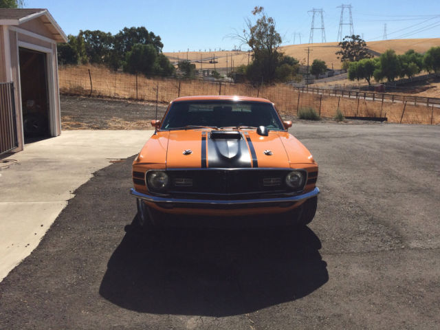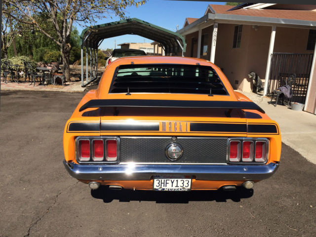 First off I must say, the car is not mine. I am selling it for my dad that due to age (85) and illness he can no longer drive. This car is an awesome vehicle. 1970 Mustang Mach1. 351 Cleveland with 4V heads. Just over 500 miles on professional rebuild. Griffin aluminum radiator, Offenhauser aluminum intake manifold, Edelbrock (1406 600 CFM I think) 4-barrel carb. FMX 3 speed automatic transmission. Power brakes (disk in front, drum in rear) power steering, Grabber Orange paint with black accents, shaker hood scoop and working hood mounted tachometer. Body is super straight. Paint, tires (P235/60R14), windows and windshield in great shape. Front and rear seats all have new upholstery, new headliner. Right now has "after market" AM/FM with CD player and 10 disk CD changer in trunk. I have the original AM/FM radio but can not guarantee it works. Title is clean and registration is current .