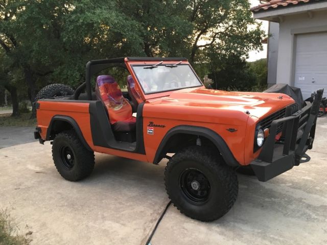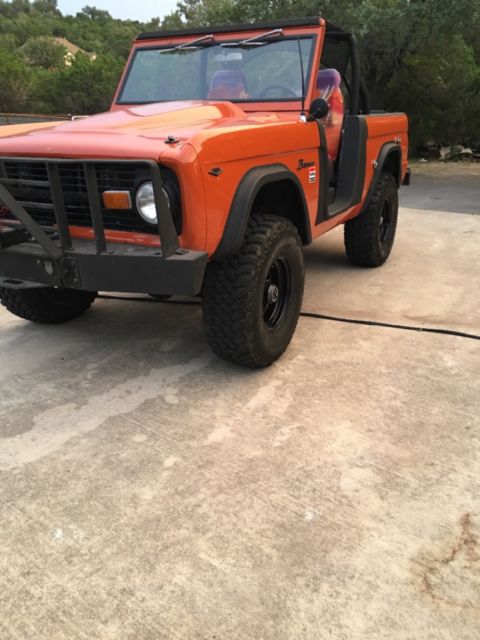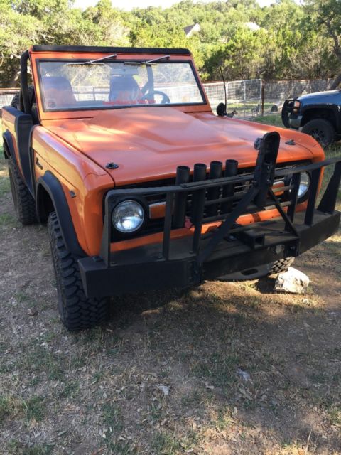 1967 Ford Bronco with 3" lift kit, 32 mud terrain tires, shifter on floor, original drum brakes all around with vacuum booster kit, aircraft aluminum floorboards and bumpers, linex on bumpers and door inserts, after market steering wheel, winch connection and receiver on front bumper, brand new holly 4 bbl, shocks and steering damper, dual exhaust on 289 V8, stereo that sounds better than one in your car with sub and amp under rear seat. Stock fuel change over valv, speedo works, fuel gauge does not work, all lights and blinkers working, antique registered and runs great! Obligate roadster with door inserts and mesh bikini top . Some minor dings in UT Burnt Orange paint job but otherwise ready to drive around like a boss to the local car shows jamming your favorite CD!! Garage kept and adult owned. 4 wheel drive works but truck is not used for off-roading 12,000 miles on rebuilt 289