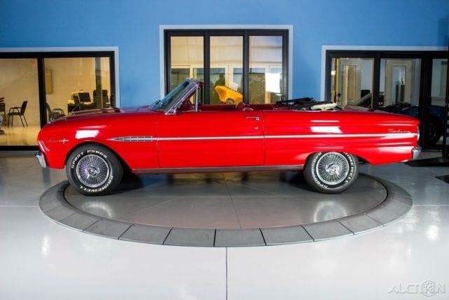 The Ford Falcon was an automobile which was produced by Ford from 1960 to 1970 across three generations. It was a sales success for Ford initially, outselling rival compacts from Chrysler and General Motors introduced at the same time. The television marketing for this model featured the first animated appearances of the characters from Charles Schulz's acclaimed comic strip, Peanuts. In 1963 there was now a four-door Futura and a Deluxe wagon. Futura Convertible and Futura Sports Convertible models were also included in the 1963 range. Later, hardtops, and the new "Sprint" model were introduced. Halfway through the model year (February 1963), the Fairlane's 164 hp "Challenger" 260 CID V8 engine was offered for the first time. The Falcon was climbing in trim level from its budget beginnings, as Ford attempted to wring more profit from the line. The only time a V8 option was available in a first-generation Falcon was the 1963½ model, and these cars were produced in very limited numbers. Sprint two-door hardtop (bucket seats) 10,479 produced and Sprint convertible (bucket seats) 4,602 produced). These first-generation Falcon Sprint cars were the basis for the 1964½ Mustangs released by Ford one year later. Many (if not most) of the interior, chassis, suspension, and drivetrain components were derived from those used on the 1963½ Ford Falcon Sprint and/or Fairlane models. In simplest terms, the 1963½ Falcon Sprint is nearly mechanically identical to the 1964½ Mustang while being aesthetically different. We have a restored 1963 Ford Falcon Sprint on our showroom at Skyway Classics. It is a beautiful Red on Red Convertible with a white soft top. The red interior is spotless and perfect from the red bucket seats, red dash with all the gauges, red carpeting, console, and radio. And yes it has a 4-speed shifter sticking up out of the red carpeted floorboard. The engine is a warmed over small block Ford with a performance Holley carb, performance distributor and red spark plug wires, chrome valve covers, red flamed chrome air cleaner and much more. This very quick Falcon sits on white letter tires and wire wheel covers with spinners, and exhaust exits thru the dual exhaust system with chrome tips, which makes it sound great but goes great too. Come see our 1963 Ford Falcon Sprint here at Skyway Classics and drive home in the car that the Mustang was patterned after! Give us a call at 941-254-6608. We also finance! Check out our financiers here at https://www.skywayclassics.com/financiers In the meantime, check out this vehicle on our Skyway Classics blog here at https://www.skywayclassics.com/blog