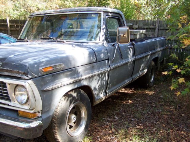 | Up for bids is this 1970 ford truck long bed. This would make a nice truck for a restoration project. It will need some work but is a complete running truck. It has a V8 in it. I was told it was a 302 but never ran the numbers so I am not sure. It has a good title. The truck is a project and will need restoring. It is what it is. Look at the pictures. If you have questions just let me know. It will need to be trailered as the mechanicals will need fine tuning. It has brakes. If you have questions just let me know. I will answer anything you need to know. The truck is located in Lancaster S.C.. I will accept Paypal or cash in person as payment for the truck. Again this is a nice project. |