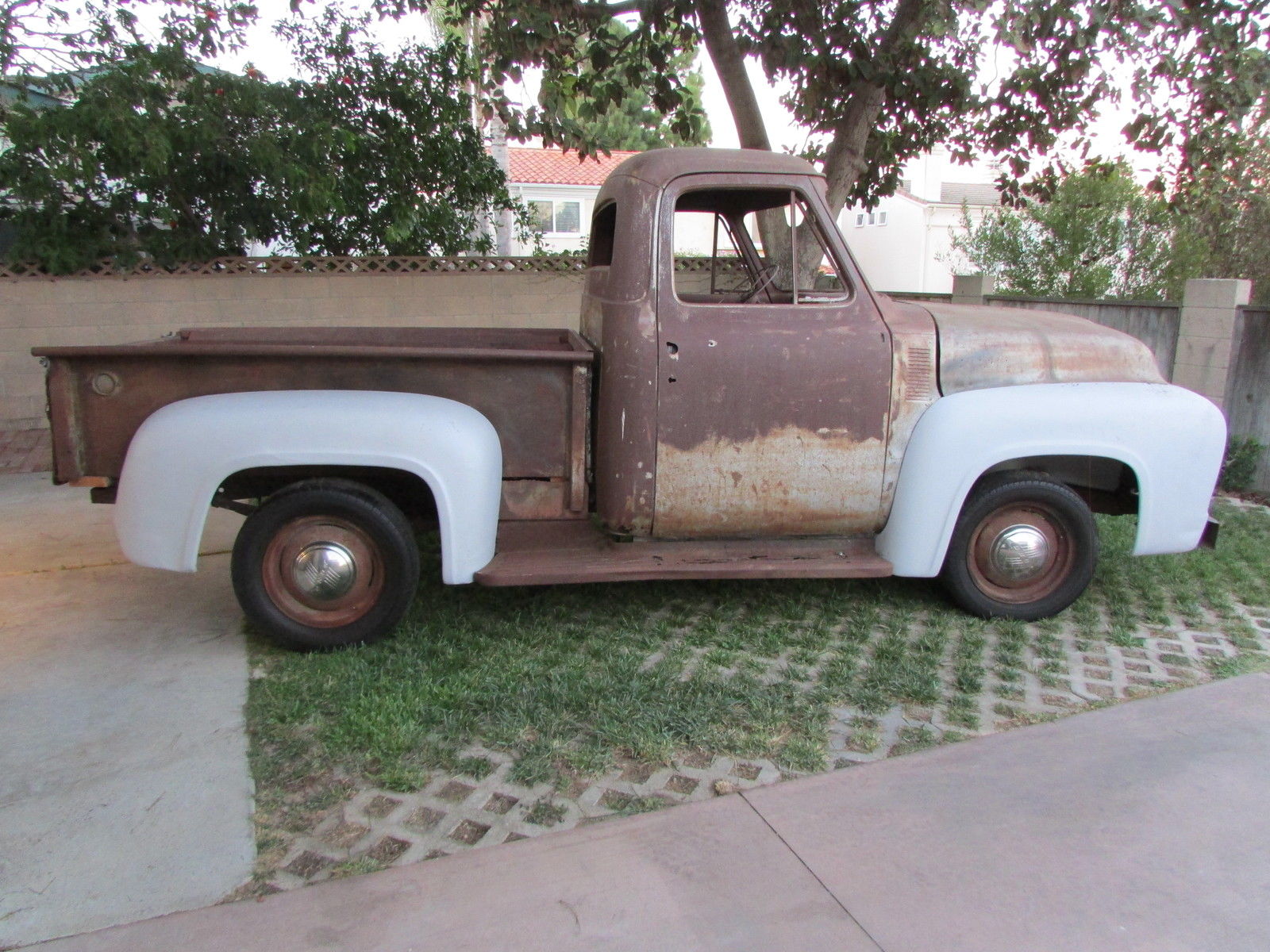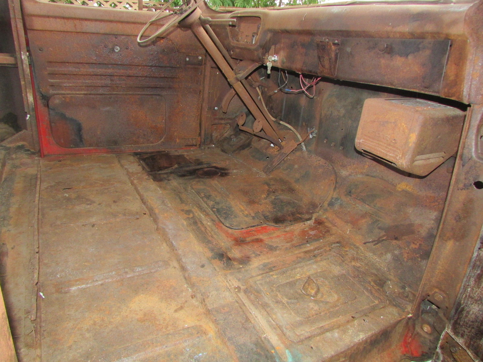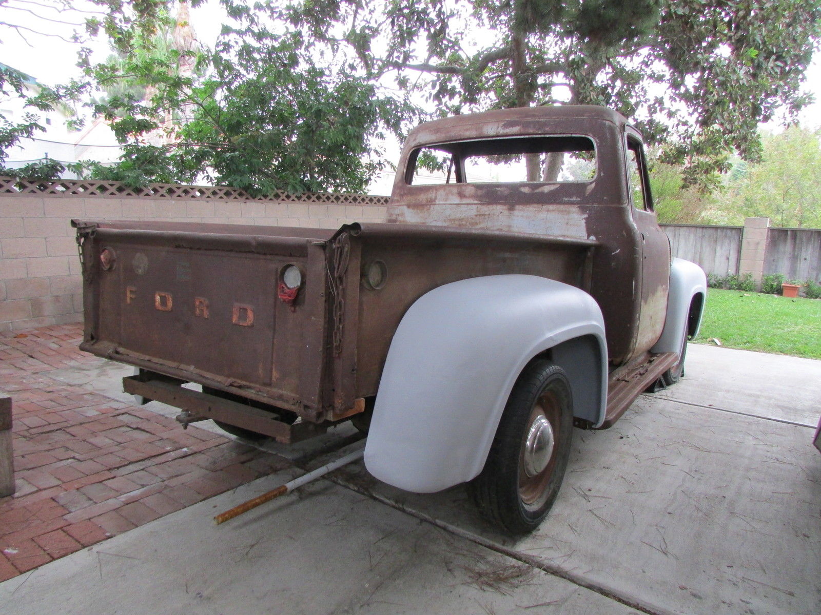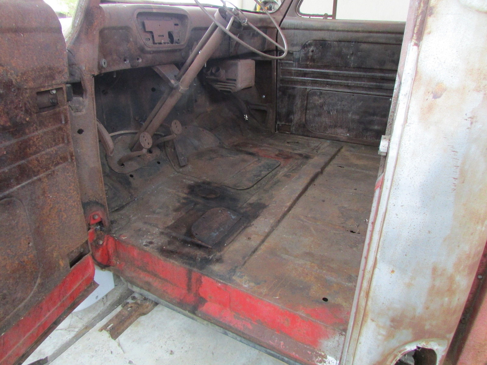 | This 60 year old farm truck is an outstanding project truck and is amazingly straight and rust free. There is surface rust and some repairable “rust through” in the usual places. Door pillars have surface rust only. We started the flathead engine before we bought the truck in 2012 (ran and sounded okay). The truck is very complete and original. Miscellaneous extra F-100 parts. including seat frame (less slider tracks). and manuals included. Work completed includes:- All front-end body parts. running boards and rear fenders were removed (big job… those awkwardly located nuts and bolts that had been there for 60 years were a challenge). - Fenders (front. front inner & rear) were chemically stripped and primed (years of dirt. rust. paint & bondo gone!). - Radiator mount. left & right front air deflector panels and upper radiator valance stripped and powder coated matte black (they look great). - All new front body attaching hardware (fenders. valances. etc. ). - Body parts have been refitted for initial alignment and checking. Fit and alignment is better than expected! Truck cannot be driven. The tires are solid and it rolls easily. it will have to be winched onto vehicle transporter. This truck is very complete but some body parts are missing… review pictures and. if you don’t see it. assume the part is missing. Contact us for more details and pictures |