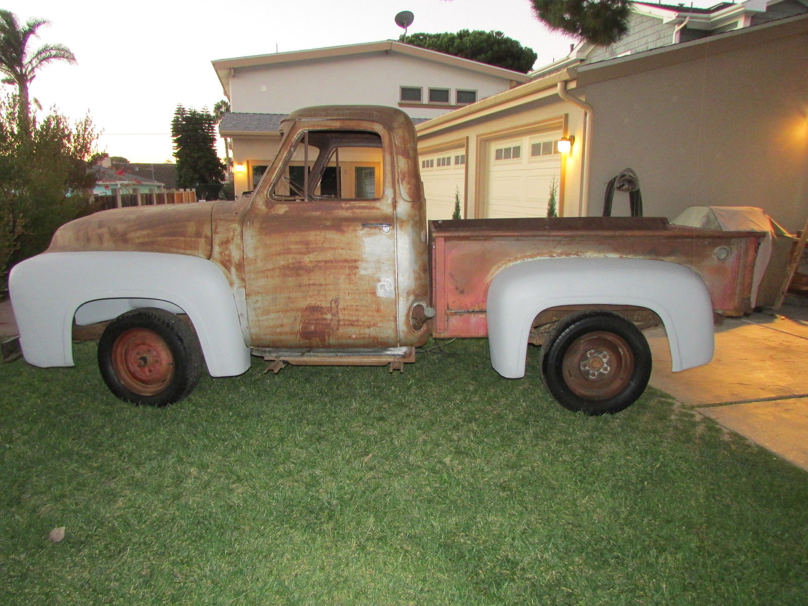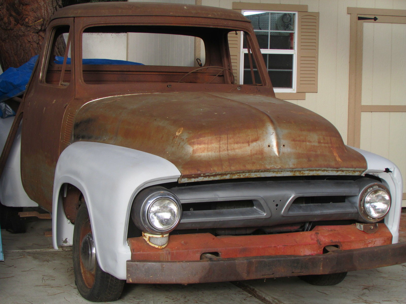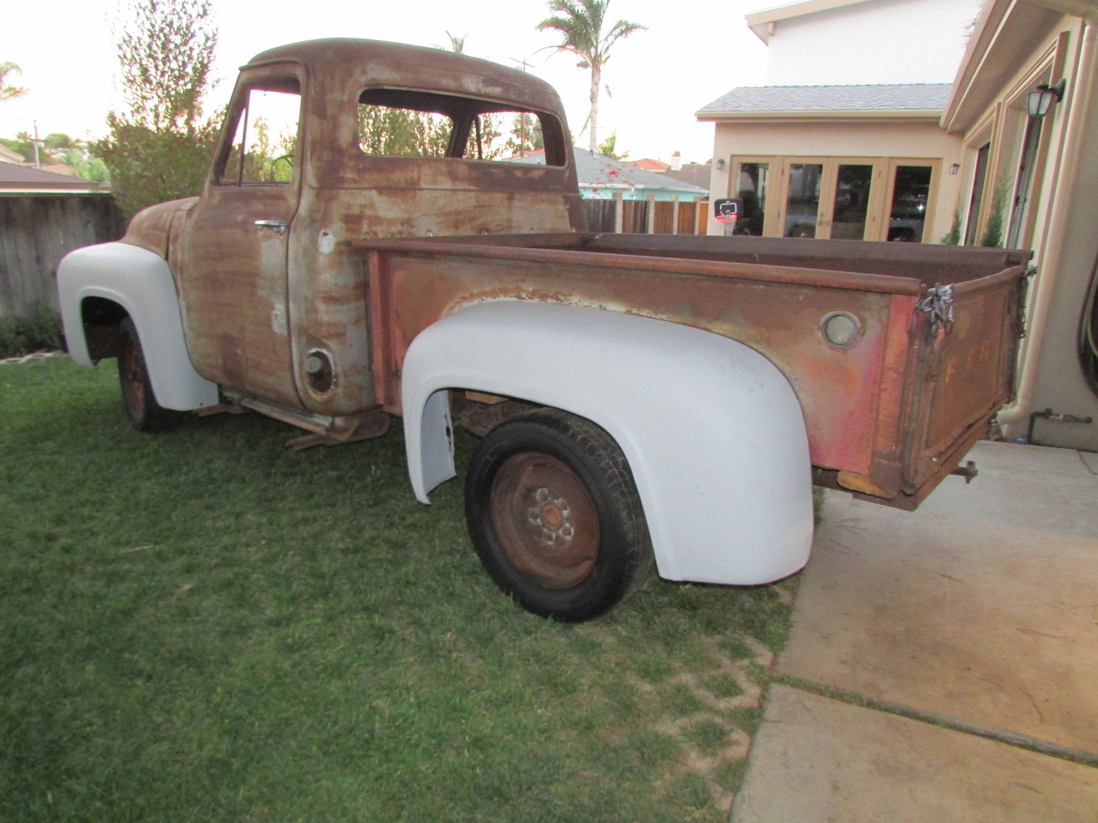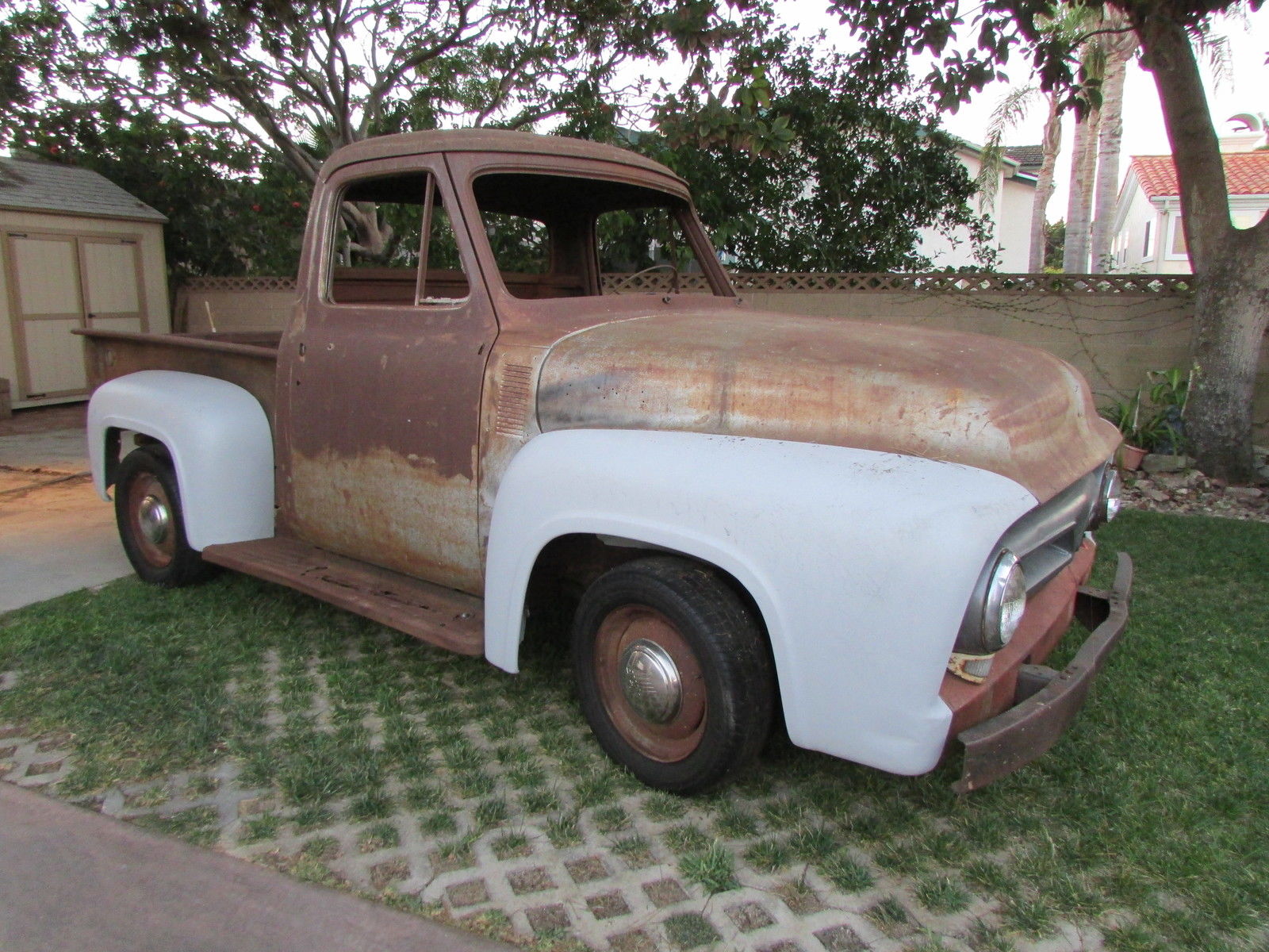 | This 60 year old farm truck is an outstanding project truck and is amazingly straight and rust free. There is surface rust and some repairable “rust through” in the usual places. Door pillars have surface rust only. We started the flathead engine before we bought the truck in 2012 (ran and sounded okay). The truck is very complete and original. Miscellaneous extra F-100 parts. including seat frame (less slider tracks). and manuals included. Work completed includes:- All front-end body parts. running boards and rear fenders were removed (big job… those awkwardly located nuts and bolts that had been there for 60 years were a challenge). - Fenders (front. front inner & rear) were chemically stripped and primed (years of dirt. rust. paint & bondo gone!). - Radiator mount. left & right front air deflector panels and upper radiator valance stripped and powder coated matte black (they look great). - All new front body attaching hardware (fenders. valances. etc. ). - Body parts have been refitted for initial alignment and checking. Fit and alignment is better than expected! Truck cannot be driven. The tires are solid and it rolls easily. it will have to be winched onto vehicle transporter. This truck is very complete but some body parts are missing… review pictures and. if you don’t see it. assume the part is missing. Contact us for more details and pictures |