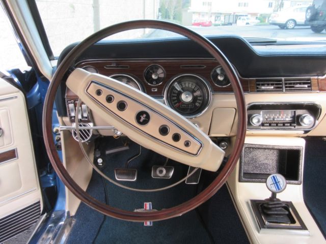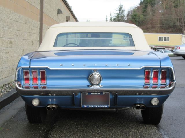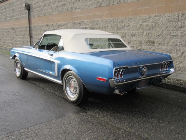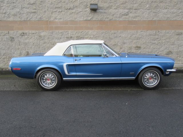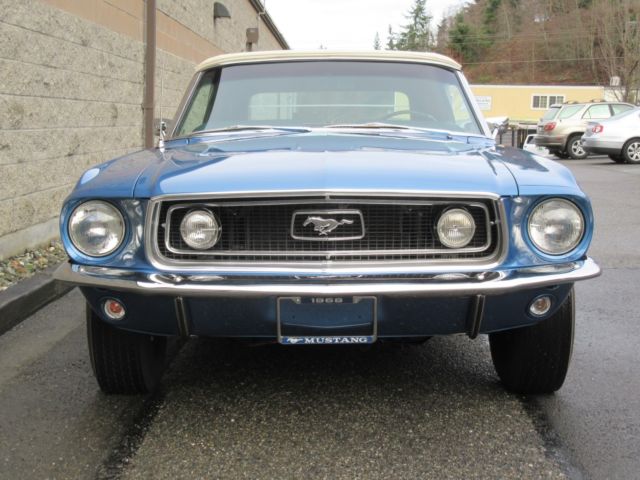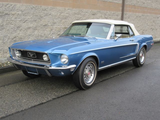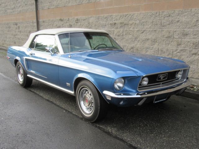 Description: 1968 Ford Mustang GT Convertible Beyond Rare - 1 Of 43 Paint/ Trim Code Very nice Restoration has had a nut & bolt restoration, one of the best in the world 1 of 493 with this motor/transmission code390 c.i. 325hp 4v, 4-speedFactory Air Conditioning 9-inch Ford 3.00 limited slip axle, tilt away steering wheel AM-FM stereo, AC (Selectaire), tinted glass, beautiful Acapulco blue White power top, parchment décor buckets, P.S., P.D.B. This car is better than new, documented by Marti report V.I.N. 8F03S201509 102,807 miles $69,950 For more info please call 425-343-7079 or 206-683-5855
