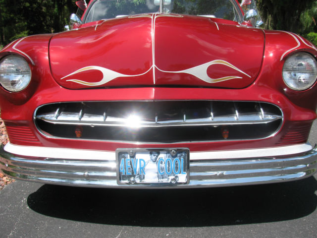 | 1950 Ford Convertible!*Rebuilt 302 motor*C4 transmission*Two door (Convertible)*French Headlights*French Taillights*53 Chevy front cavity with custom float and grill*49 Plymouth ribbed bumpers*Frenched in antenna's *55 Pontiac look alike side trim*Tripple lake pipes*Dummy spot lights*Custom continental kit*Rust free and NO dents*68 Gto buckets with silver and burgundy tuck and roll*am & fm radio with cd playerThis car has one over 40 Trophies and was featured in Classic Custom magazine. |