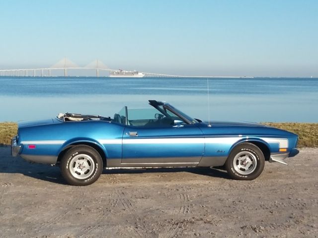 1973 Mustang Convertible. 351 Cleveland motor total rebuild, now a complete roller motor with a Modern Tremec 5 speed, modular front end with coilovers,power rack and pinion steering, modern A/C, multiplelayers of soundproofing and heat shield from top of firewall to trunk. 3 point seat belts for safety. This car is a blast to drive, will rev to 6300rpm (after brake-in) and smoke the tires whenever you dare. Mild mufflers sound stock until you plant your foot to the floor. This has been my project since 2012. Situations change, so now it is time to pass it on. It was built to be a real driver- I wanted it to handle better than stock, but look as close to stock as we could. Car had a fairly solid body when I bought it and ran "ok". Turns out the front frame rails were rusted thru, and the inner fenders were patched many times. We decided to start fresh from the firewall forward. Only parts saved were the outer fenders and hood. New Dynacorn one piece inner fenders/frame rails on both sides, as well as new torque boxes fabricated. I have always been a "keep it stock" person- but it did not seem to make sense with my limited budget to spend almost as much money for original parts than it would be to upgrade the performance. So we added a new front suspension setup from Rod and Custom with a power rack and pinion set up and new power steering pump. New disk brakes up front, new booster, master. I did replace the rear suspension with new repro parts- springs, shocks, all bushings etc. The orig C6 was not always shifting right, so we installed a Modern Drive Line new T5 setup instead of spending for a rebuild on an old 3 speed auto. A new manual 5 speed and all new components- bell housing, clutch, cables- pedal, Hurst shifter etc. New drive shaft and all u-joints. New Air conditioning that blows very cold. To accommodate the air we re-wired the car completely with a American Auto Wire kit. The shop took it upon themselves to add a set of Dakota Digital gauges- to make the wiring easier for them I suspect..... They work great- and I am ok with them, but I would love to have the stock ones back. Stock gauges will all be included in sale- they all work except for the volt gauge. Original Speedo shows 73k miles, I have approx 2k on the new gauges. The last item done was the motor. I was not happy with the performance after all this money spent on the above work- so I took it to Forte's Classic Garage in Largo Fla- look them up- they do great work and specialize in 351 Cleveland motors. Engine is spectacular!!!! This turned out to be an original 4v, 4 bolt main engine. Bored 40 over, crank re-done, and heads completely rebuild with all new components. It is now a complete roller motor. Stock exhaust manifolds bought on ebay were sent to the mach. shop to be sure they were flat, H pipe with mild turbo dual mufflers. New Edelbrock carb with electric choke and intake manifold. High perf. aluminum water pump, new high torque starter. New 165amp alternator so the air and dual cooling fans would be no issue- also plenty of amps left for a great stereo. New Champion 3 row aluminum radiator with dual Spal electric fans to keep the Cleveland cool. NASA style hood is original- per Marti report- I added the working ram air intake. Also found a set of original valve covers- the originals were replaced with aftermarket crap before I came along. This car is very reliable- I have put approx 2000 miles on it since the engine rebuild with no issues. It went back to the shop after the break in to get serviced, and now with a little more miles on it it runs better every time I take it out. The paint and power convertible top with full rear glass was done approx 4 yrs ago. Car has been in garage since then. I made a mistake doing paint first- I stupidly thought I had a pretty good car that just needed paint and suspension. As a result I have a great PPG paint job in the original Blue, that is now nicked up from a few years in and out of 2 shops. It was topped with 3 coats of PPG clear so we could color sand- but the sanding part never happened. We prepped for paint very well- Stripped to bare metal. I am not a paint expert, the car has an epoxy primer then a sanding primer- did a lot of primer sanding at a friends body shop- so the car really has minimal orange peel. The plan was modified to touch up the dings after all the other work, then color sand. I have not gotten to that. But- this is a driver, and I would say the paint is above average for a driver just how it i New 3 point seat belts.New carpet, new door panels and dash. Dash is the more expensive original tooling repro.Floor has multiple layers of soundproofing and heat shield. The floor and especially the rear seat was just too hot with just carpet on a normal day. The entire floor and rear seat stays cool to touch now, even after a good drive on a hot day here in Florida. Makes the air even more enjoyable!! Frame rail bracing connects front to rear by Tin Man fabrication. These are welded in place and make the entire car extremely stiff- you can feel the difference from stock when driving. Press on the car and bounce it around by the fenders- there is no wallowing from front to back- very solid. All chrome replaced, including the convert. top trim.All rubber from hood, doors, windows to trunk replacedBoth rear tail light assemblies completely new as well as the 4 marker lights, grill, grill SS molding, all emblems.Power top works with no issues and is about 3 years old. Full glass rear window. Never outside, still looks new.Top well liner in place and in great shape.Original 8 track am/fm stereo in dash- lights up, but I do not have it currently wired up, also no speakers in the doors. Was going to do that last- or maybe upgrade to something new. I have a set of repro widow guides I have not installed yet. Tires have approx 3000 miles on them and are about 3 yrs old.I started to soundproof the trunk, then decided to stop in case someone might think I was 
