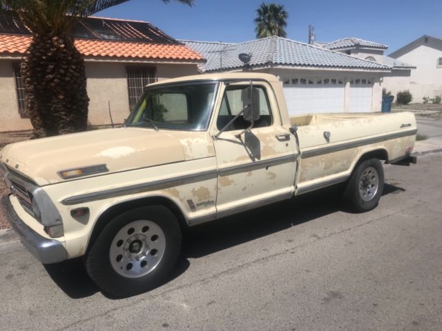 Up for sale is my 1969 Ford F-250 390 Camper Special. I hate to sell it but I have a daughter in college and must sell some toys to keep her there. The Truck runs and drives excellent. Just drove it down from my house in Southern Utah to Las Vegas about 2 months ago. Original number matching 390 motor that runs Awesome! Motor is very powerful and sounds awesome. 103k Original Miles. Smooth Automatic 3 Speed Tranny. New Upholstered Black Bench Seat. Tires look good but have some major cracking going on from sitting in the Las Vegas/Southern Utah Sun but I continue to drive it that way without problems. 90-95% Rust Free, Some surface rust in the bed and underneath the Truck but I don't see any rot at all....No Leaks, No weird sounds, Very tight ride especially for 1969 F-250. Great Candidate for a complete restoration, Just needs paint to be Awesome looking truck. Its hard to find a good older truck that runs so good. No buyers remorse here. 7 day, No Reserve Auction. The Last bidder will win this truck! Call or Text 702-354-3324 with any questions. I can send you a small video to your cell phone of the truck running if you want to see it. I have a few shippers that I know in the Las Vegas Area and can get you a quote to ship anywhere in the U.S just ask......
