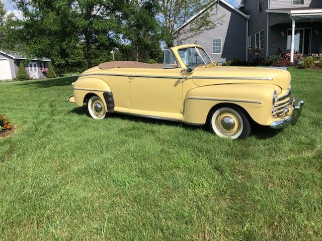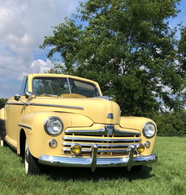 Hard to find '48 Ford convertibles like this anymore; just as Henry made it. And this car has a ton of options, some of which a very rare. Please take note of pictures 6 --13 which show many of these options. #6 shows the halogen head lights, the turn signals, fog lights and the spot lights; #7 the blue dot taillights and the backup light; #8 the trunk light; #9 the under hood light; #10 the fender skirts which are not shown on the car. These give the car acustom look and I prefer the open wheel to see the large whitewall tires; #11 the very rare FoMoCo drop down tintedPlexiglas sun visors. I still have the box they came in. #12 working clock and radio #13 working heater with reversing motor that becomes a defroster This car has had two complete restorations; one in 1985 bythe previous owner and one starting in 2010 with completion in 2012. The last had too much to mention here, but hereis a list of themajor items: ~ Complete new interior ~ upgrade to a modern top lift system and electric w/s wipers ~Complete brake job ~complete fuel system restoration; carburetor rebuild,tank flush, new copper lines, fuel pump, sending unit ~complete exterior paint and new top with boot; engine removed, car disassembled complete 2 stage paint top and bottom with all replated chrome and new rubber. Dash and interior trim wood grain refinishedto original standards. ~Transmission overhauled; new clutch, pressure plate andt.o. bearing ~Complete wiring harness installed with turn signals and brighter lights where necessary ~rebuild radio and clock to original. "I love to hear that clock tickaway" ~Replace tires with period correct whitewalls and improved handling radials |