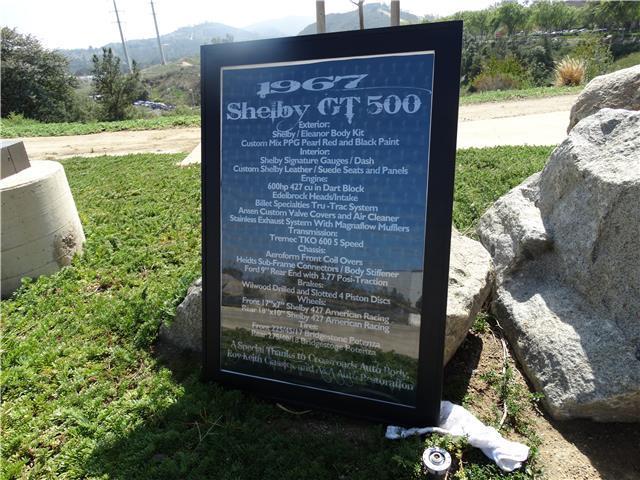 1967 Ford Shelby GT 500427 CU, 5-SpeedVin/ Serial: 7R02C102001Engine: 427 CUTrans: 5-SpeedColor: Pearl Red/ BlackInterior: Custom Shelby Leather/ Suede Seats and PanelsHighlights Exterior:• Shelby/ Eleanor Body Kit• Custom Mix PPG Pearl Red and Black paint Interior:• Shelby Signature Gauges/ Dash• Custom Shelby Leather/ Suede Seats and Panels Engine:• 600hp 427CU in Dart Block• Edelbrock Heads/ Intake• Billet Specialties Tru-Trac System• Ansen Custom Valve Covers and Air Cleaner• Stainless Exhaust System with Magnaflow Mufflers Transmission:• Tremec TKO 600 5 Speed Chassis:• Aeroform Front Coil Overs• Heidts Sub-Frame Connectors/ Body Stiffner• Ford 9" Rear...End with 3.77 Posi-Traction Brakes:• Wilwood Drilled and Slotted 4 Piston Discs Wheels:• Front 17" X 7" Shelby 427 American Racing• Rear 18" X 10" Shelby 427 American Racing Tires:• Front 225/45/17 Bridgestone Potenza• Rear 275/40/18 Bridgestone PotenzaCustom License Plates will be transferred with vehiclePlease contact Ryan Klotz, 760-733-8254 with any questionsTerms & ConditionsYou must be 18 years of age or older and a resident of the continental United States to bid.By bidding on and/or agreeing to purchase this vehicle, the bidder/buyer agrees to be bound by the following terms and conditions:All advertised prices plus government fees and taxes, any finance charges, any dealer document processing charge, any electronic filing charge, and any emissions testing charge. Seller reserves the right to end auction early in the event the vehicle sells locally. All financing offers are based on customer's approved credit and are offered through third party lenders, not affiliated with Seller.Winning bidder MUST communicate with Seller by e-mail or phone within 24 hours of the end of the auction to make arrangements to complete the transaction. If Seller cannot confirm your intention to buy or the sale is not completed within 5 business days, Seller reserves the right to re-list this vehicle or sell to any other bidder. Before the vehicle is released for shipment to the Buyer, all sale-related and title-related paperwork must be accurately completed, signed and returned to Seller.Due to demo test drives and mechanical inspections, the mileage of the vehicle represented might be slightly different than the mileage stated when the vehicle was first listed on eBay.Vehicle is offered for sale by a licensed California vehicle retailer. Winning bidder must sign a California Retail Installment Sales Contract and accompanying paperwork prior to delivery of vehicle.Bidders acknowledge and agree that the negotiation, bidding and purchase of this vehicle and execution of the Retail Installment Sales Contract takes place in the city of Vista, County of San Diego, California. Accordingly, the purchase and the purchase contract, regardless of conflicts of law and venue, shall be governed by and construed according to California law. Bidders consent to the personal jurisdiction of the courts of California. Any action or proceeding relating to or arising out of this transaction or the subject vehicle shall be filed, if a State action, in the Superior Court of the State of California for the County of San Diego, North County Division or if a federal action, in the 9th Circuit, California Southern District.WarrantyThis vehicle may have all or a balance of the manufacturer's warranty. See listing for details. Otherwise: Vehicle is sold "as-isâ€. The Seller makes no warranties, express or implied, on the vehicle, and there will be no implied warranties of merchantability or of fitness for a particular purpose. This provision does not affect any warranties covering the vehicle that the vehicle manufacturer may provide.Shipping & DeliverySeller may assist Buyer with finding a commercial carrier offering discounted shipping at Buyer's request with the following understanding: Vehicle is sold "where-is" FOB at Seller's location. All shipping arrangements are made as a courtesy to Buyer. Seller is not affiliated with any carrier. Any claims or other communication regarding shipment of vehicles will be between Buyer and the carrier and not with the Seller. The amount of time it takes for delivery depends upon the Carrier selected. Buyer is responsible for any and all shipping, transportation and insurance costs. Vehicle is deemed delivered when buyer, buyer's agent or transportation company removes vehicle from Seller's location. Seller is not responsible for any liability, loss or damage incurred during shipping or transportation.Sales TaxBuyer is responsible not only for knowing their own states' laws regarding taxes and fees, but also remitting the proper taxes, fees, and documents for their state. All taxes and fees must be paid in full in order for the vehicle to be titled and registered.