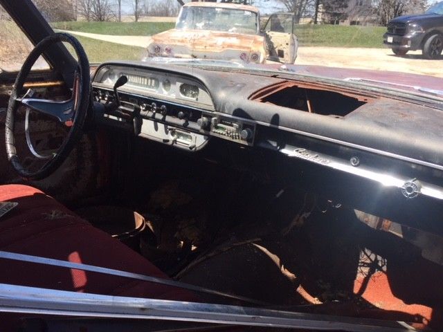 This is a great example of a 1960 Ford Starliner. This is the rare chance to find an almost complete car for that dream restoration. This car came off the assembly line in California and spent a portion of it's life in North Dakota before making its way to Wisconsin in the late 70's or early 80's. The car was then repainted and someone put an FE motor in it and "modernized" the interior. The car was parked in 1992 and sat in a barn until February of 2018. The body on this car is in excellent shape for a car that is 56 years old. There is some light rust and bubbling in the areas you would expect, but by no means is this car rusted out. Please look at the pictures to see the rust spots. The car was originally a Y-block car, but it now has an FE motor in it. We have not researched to determine what the motor is, but we are assuming it is a 352. The motor has been sitting for 30+ years and we have not tried to start it. The motor does have aftermarket valve covers, intake manifold, etc. The car sits on a set of gold keystone mags that have some peeling. The interior was "modernized" in the 80's and requires a complete re-do. Most of the trim and pieces are present. This car does not run, but rolls freely. The car does have a clear title. Transportion will need to include the ability to pull the car onto a trailer. This car is for sale locally and we reserve the right to end the auction at any time. Buyer to put $500.00 down via PayPal within 24 hours of the auction ending, pays the full amount within 7 days and arrange for pickup within 14 days. Don't miss the rare chance to buy a Ford Starliner and build the custom of your dreams! |