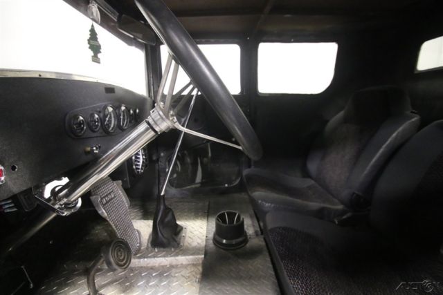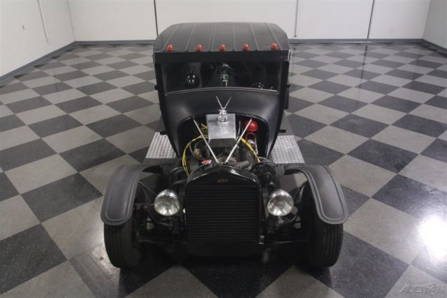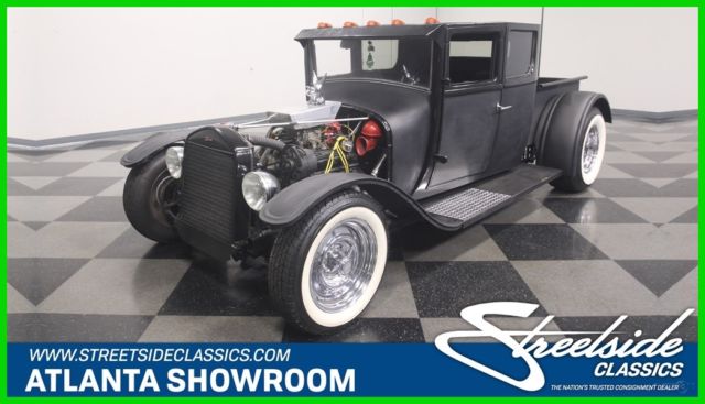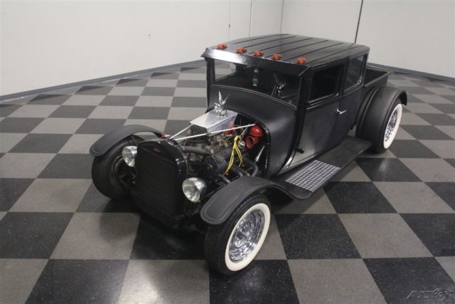 You either get rat rods or you don't. They aren't built to be pretty, but they are possibly the most accurate reflection of early hot rodding's roots. Cars like this 1927 Ford Model T pickup were built from scavenged parts that were a unique expression of the builder's vision, and no two are alike. In a world filled with me-too plastic '32 coupes, something like this stands out everywhere it goes. Obviously satin black is a mainstay of the rat rod movement, and it works exceptionally well on cars like this Model T truck. No-nonsense, low maintenance, and designed to show off the builder's custom touches, it has a timeless look that will not go out of fashion. The familiar square Model T cab appears to be a coupe, not an original pickup, or at least if it was a pickup, it was extended to vastly improve legroom inside. There's a modest bed out back and the lowered and channeled stance makes it look low and lean without being claustrophobic inside. Factory Model T fenders were also modestly reshaped to fit the wider rear wheels and there's a simple black radiator shell up front. A few whimsical touches include diamond-plate treads on the running boards, a rat trap in the bed, and a giant stop lamp on the back of the cab, all part of being unique. It's pretty austere inside but that doesn't mean it's not comfortable and functional. They cleverly dropped the seats between the frame rails, so it has good head room even with the chopped top and those are bucket seats out of a late-model that are surprisingly comfortable. More diamond plate on the floor helps with the industrial look and a simple Ididit chrome steering column and removable 3-spoke wheel give it a vintage feel. There are cool Faria gauges that look suitably retro and a long-handled Lokar shifter gives you someplace to hang your hand while you drive. Fun details include the Moon race-style accelerator, the under-dash heater/fan, and a cow horn. Like most well-built rat rods, this one is fully functional and safe to drive, not just thrown together for effect. That matters. Power comes from a 350 cubic inch Chevy V8, but with the blacked-out look and some custom parts, it's tough to recognize. Most visible is the custom aluminum air cleaner housing, which is topped by a flying pig hood ornament. Finned valve covers might have been borrowed from a Corvette and there's a big Edelbrock intake up top. There's a good-sized cam inside that gives it that lumpy idle that makes a true hot rod, but with an HEI ignition system, it fires easily and drives great. Rack and pinion steering makes it easy to handle and disc brakes up front are more than adequate given the truck's miniscule curb weight. The front suspension is familiar Mustang II so it rides surprisingly well and there's a GM 10-bolt on ladder bards out back. A TH350 3-speed automatic transmission simplifies the driving experience and the stance is just about perfect with chrome steelies and staggered 165R15 front and 285/70/15 rear whitewall radials. Old school, the next best thing, or simply a traditional rod that's ready to rock? How about all of the above? Call today!