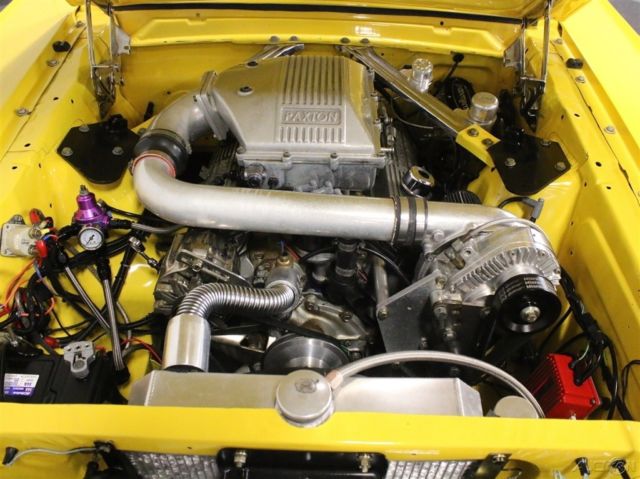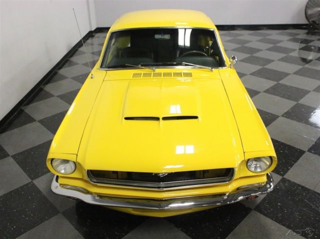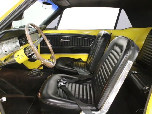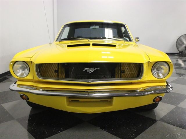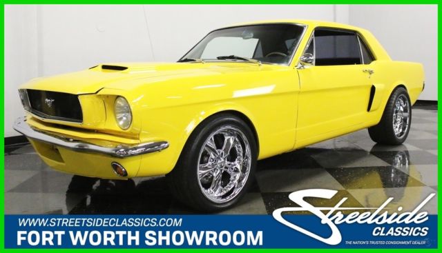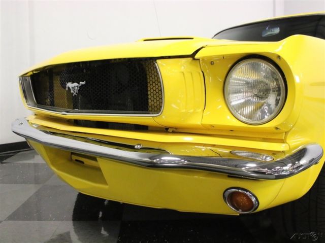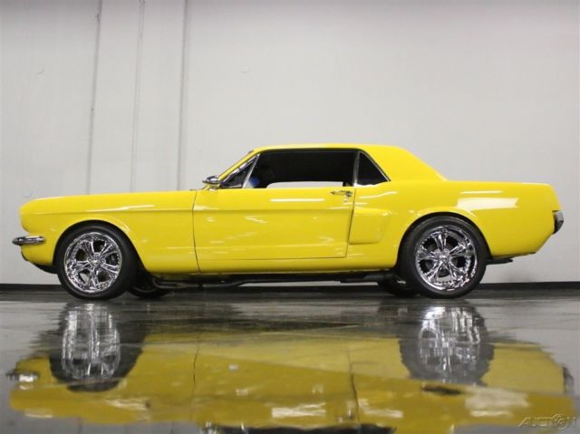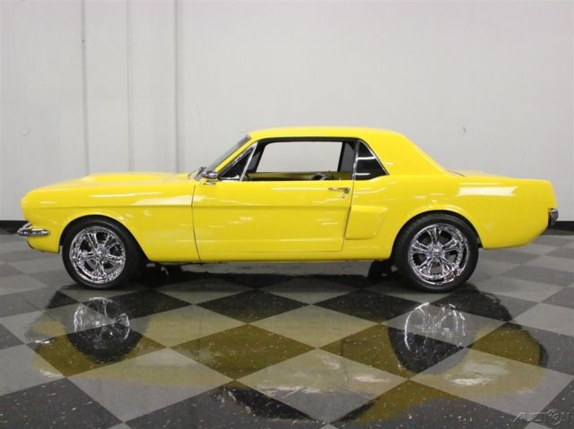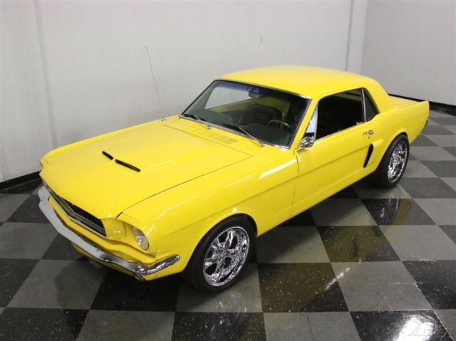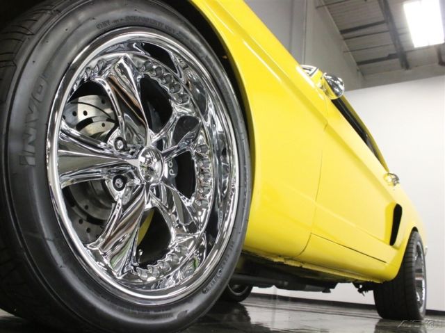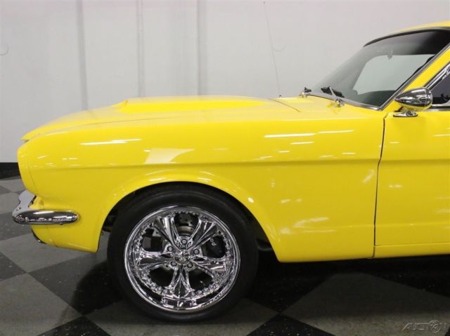 If this 1965 Ford Mustang's bright Ferrari Fly Yellow paint isn't attention-grabbing enough, all you have to do is pop the hood and show off the Paxton supercharged 289, which has been punched out to a stout 347 cubes. Add in a beefy suspension and some giant disc brakes and you have one of the coolest early Mustang resto-mods we've ever seen. There's a pretty extensive magazine spread on this car, and given the eyeball-popping Ferrari Fly Yellow paint, that shouldn't be surprising. Starting with a clean coupe, everything was taken apart, massaged, smoothed, and refinished to give you the incredible car you see today. It's still early Mustang, there's no doubt about that, but with the neatly integrated Shelby-style hood and side vents and a lot of shaved trim, it takes on a very purposeful look. Fit and finish are quite good, certainly better than when these cars were new, and there's still plenty of chrome, so you don't have to worry about its identity getting erased. No stripes, spoilers, or other add-ons were needed to give it a trick look, although there is a neat flip-up fuel filler cap on the rear panel, which balances the Shelby hood up front. A mesh grille and a functional cut-out in the lower valence give the front end a race-ready look that really works well on the neat little coupe. This is a really impressive car. At a glance, the interior looks pretty stock, well, except for the bright yellow door panels and dash. However, the seats are stock Mustang buckets, there's no console, and while the gauges are modern, the instrument panel is standard Mustang. Heck, even the woodgrained steering wheel is something you would have seen in 1965. However, the upgrades are there to help make the car work better, so you have a full array of Auto Meter dials, including a pair on the A-pillar, so it's easy to monitor the blown small block under the hood. A Pioneer AM/FM/CD/Bluetooth stereo system uses kick panel and package shelf speakers plus a pair of subwoofers with trick enclosures in the trunk to fill the cabin with sound. New carpets, billet pedals, and a 5-speed shifter help with the complete, ready-to-go look. The trunk is a show piece all by itself, so make sure you open it up at shows, because people are really going to want to see this! The engine is a 289 cubic inch V8, bored and stroked all the way to 347 cubic inches. But just in case that isn't enough for you, there's a Paxton Novi 2000 supercharger that pressurizes the stout small block with nine pounds of boost. Don't worry, the steel Scat crank and forged I-beam rods don't mind and the aluminum Edelbrock heads help build plenty of horsepower. A full roller valvetrain from Comp Cams gives it that wicked sound and an MSD ignition system lights it all up. Lots of shiny chrome and billet aluminum under the hood make it look ready to show but with a new Tremec 5-speed manual transmission and new driver friendly clutch, you're probably going to want to go instead of show. A 9-inch rear end with 3.55 gears inside is plenty for the supercharged motor and it's been upgraded with giant Wilwood disc brakes up front, tubular A-arms, and a rack-and-pinion steering system to keep it all under control. 17-inch in the front and 18-inch in the rear Foose Torque Thrust wheels fill the fenders with 245/40/17 and 285/35/18 Nitto performance radials and adjustable rear air shocks. Check out the workmanship and the hardware, then look again at the price. It's like buying all the parts and someone has already put them together for you for free. Call today!