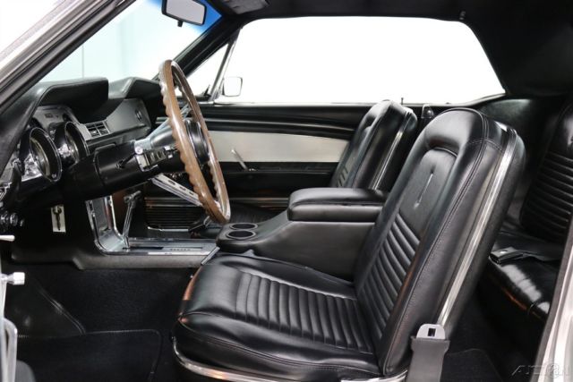 Two years after Ford's prized pony car creation captured the interest of the American car buying public, its manufacturer skillfully added some room to its engine compartment in order to accommodate a bona fide big block and expand its already sizable legion of devotees. The result was an undisputed hit, as this 1967 Ford Mustang GTA ably illustrates. It's logged an unusually low 78,000 miles and this numbers-matching beauty will pull into its next owner's garage carrying not only build receipts as backup for the work that's gone into bringing it to top form, but also a Marti report to testify as to its authenticity. The Silver Frost exterior shade is the color it began life with. You don't see many on the road still decked out this way, so it's nice to see the color so well-represented. A repaint performed a while back really freshened things up and time has been kind to this classic - it's obviously been very well sheltered from the elements. The body is topped by a black vinyl top that's in equally impressive condition. There are no glaring blemishes to detract from its impact and its body panel alignment is very much on point. From front to back, the collection of chrome on this Mustang is in very clean shape - the bumpers both fore and aft really look great, as does the signature running corralled pony situated on the front grille. Tinted fog lights up front add a special touch. The black vinyl interior retains a factory look, as well as an ultra-clean condition that indicates not many people have passed in and out of the doors. The covers of the front bucket and rear bench seat don't show any visible wear and have a nice fresh glow on their surfaces as they sit over black carpeting that looks to have recently been replaced. An aftermarket extension sits over the center console, offering welcome cupholders and some storage space. Air conditioning was far from a given back in the '60s, but it's on board here, and while it will likely need a simple freon charge to perform at its best, it's blowing plenty strong. The brushed aluminum panel on the instrument cluster adds a deluxe look and surrounds an assortment of gauges that are all crystal clear and functioning just as intended. Just above, the dash pad is free of any cracking - a welcome sight in UV sensitive black upholstery. The trunk area is just as clean as you would expect, based on the rest of the car, with a full-size spare resting on its vinyl lined floor. The original 390 cubic inch V8 rests inside a very clean engine bay. It already offered plenty of torque to knock you back in your seat when it first left the factory, and a recent rebuilding has brought it back to top form. During the process, a 4-barrel Holley carb and a mild performance cam were added to the mix to up its power output even further while providing a very appealing lope at idle. Wearing a properly badged chrome air cleaner and a pair of chrome valve covers that are complemented nicely by a chrome brace spanning the shock towers, the engine starts promptly, runs very strong while sending a great-sounding note through its Flowmaster exhaust and teams with an also original 3-speed automatic C6 transmission. Power steering and power brakes that feature discs up front make this classic easy to navigate and bring to a stop on its stock 15" wheels outfitted with BF Goodrich T/A radials. The first generation Mustang was one of the most popular cars ever introduced and you won't likely find a more sterling representative than this 1967 Ford Mustang GTA. Call today!