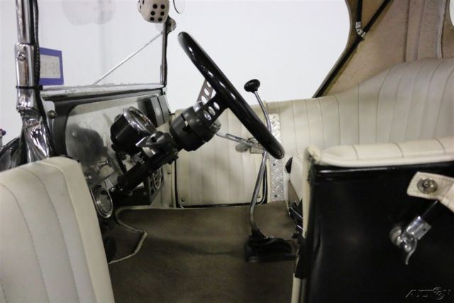 It's a super stylish street rod based on what's arguably the most influential car in American history. This 1923 Ford T Bucket is a great looking, well configured ride, with fresh power under its hood that sounds so good you'll want to fire it up just to take a listen. It's an undeniable head turner that comes equipped with features to make it equally at home drawing attention on city streets or waging battle as a worthy competitor on the local car show circuit. Due to their sheer novelty, most T Buckets have a certain cool factor already on board, but it takes planning and execution to take things to the next level. When you see the way the black paint on this vintage Ford contrasts with its chrome suspension parts and sidepipes, how its exterior fittings pop against their dark surroundings and how everything blends together so seamlessly, you'll know right away that this street rod is already there. Its black paint looks strong and if you wanted to take it up a notch, a little elbow grease will get it there. The pinstripes on the radiator cover, rear end pumpkin and surrounding the brake lights are a great finishing detail. A clean white convertible top sits in place for protection against the elements, fitting great and sporting a clear plastic window in back. Take notice of the low-slung stance - it fits this aggressive looking roadster perfectly. A very nice white vinyl interior sits inside the doors, featuring a tuck and roll pattern on the fresh-looking bench seat that's matched by the door and kick panels. Just in front, the floor shifter has plenty of height and sits within convenient reach. The dash area is very nicely laid out, with an assortment of SunPro gauges sitting in the aluminum plated cluster that are easily readable and fully functional that are joined by the SunPro tach mounted on the steering column. The push button starter is a nice added feature. An aluminum 8-gallon fuel cell sits alongside a securely mounted battery in back, stylishly concealed by a white vinyl cover that features the same tuck and roll pattern as that of the seating. When a car features an open engine compartment, aesthetics joins power output as a top priority. The 350 cubic inch V8 on display here has things covered on both accounts. It's only logged about 400 miles since being installed and is running and sounding great, while producing a deep, aggressive exhaust note into aftermarket headers leading to a pair of very sharp looking sidepipes. It's armed with an Edelbrock 4-barrel carb sitting on a Weiand intake manifold to up its power game and receives maximum spark that's delivered via an MSD Blaster 2 coil. The engine sits in front of an eye-catching aluminum firewall and wears a pair of chrome valve covers that blend perfectly with the other components inside the engine compartment, including chrome air cleaner up top and the chrome alternator and aluminum fan and housing just in front. A 3-speed automatic TH350 transmission sits just behind it, shifting with smooth precision. Power disc brakes at all four corners provide fade-resistant stops as this great looking street rod cruises on its set of 15" polished aluminum wheels, outfitted with Cooper Trendsetter tires up front and Hankook Ventus tires in back. A look below at the undercarriage is a must in this case - the frame looks great alongside the chrome suspension components both in front and in back. Very nicely configured and amply powered, this 1923 Ford T Bucket carries all the visual impact you could want in a street rod. Call today!