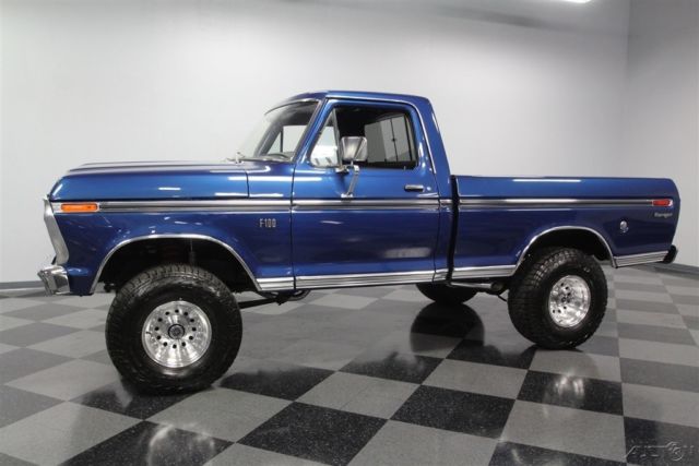 Power, poise, and plenty of attitude â€" this 1974 Ford F-100 Range XLT 4x4 has it all. Check out the shining metallic paint, a terrific V8 growl, and absolute freshness that comes from a major restoration that was completed less than 5 miles ago! A truck like this deserves a bold application like the freshly applied bright dark blue metallic. It's an $8,000 investment all on its own, and the color adds plenty of bright personality to counterbalance the all-out tough 4x4 stance. Plus, the shine it radiates nicely complements the upper-echelon trims like this Ranger XLT. They had a ton of bright work, including a style line built right into the sheet metal. Plus, the ribbed rockers, flared wheel arches, and mirror-like sport bumpers are all part of what makes this a premium pickup. That's why they invested so heavily into all these pieces â€" spending $5,000 just in these details! There's even a brand new set of racing-style American Racing alloys to add to the overall flair. It creates a total package that you'll love showing off. But you don't own a 4x4 just for pleasing others. The bed has protective liner paint and you have wide tow mirror just to remind you that the right truck can still work as hard as you do. The interior feels just as fresh as the exterior. Remember, with only five miles on this since restoration, there hasn't been any time to put any wear and tear on the interior. The carpeting, door panels, and leather Lariat headliner coordinate with this to give you a very uniform presentation. There was a special eye to keeping this feeling period-correct, so even the seat belts were restored. Plus, upgrades are subtle, like the AM/FM stereo w/digital tuner that's a Retrosound unit to blend in nicely. You have the classic Ford dual-spoke steering wheel that gives an excellent view of the factory gauges. And your favorite factory piece will likely be the sliding glass rear window. After all, when combined with the side vent glass, they provide the best old-school truck breezes. Under the hood is a very cool motor. Just like the rest of the truck, they invested nicely in making this looks correct but fresh. So the bold big blue block, valve covers, and air topper all radiate from within the tidy black engine bay. This is a big truck, so fortunately, there's a big motor to move it around. The 360 cubic-inch V8 is a powerful Ford legend. It's been enhanced further with a large Edelbrock 750 CFM four-barrel carburetor, Edelbrock intake, and headers that feed the growling side-exit dual exhaust. And when you're spending thousands $$$$, the engine bay details are on the list, too. That means changing all the fluids (engine oil, front/rear diff, transmission, transfer case, etc.,) new rear axle seals, and a new radiator to keep it all running cool. This is a tough 4x4 with a lifted stance and new Falken Wild Peak A/T tires. But no matter if you're on the street or trail, you'll appreciate the power steering and all new power brakes. Plus, the four-speed manual transmission means you have complete control over this rumbling V8 wherever you go. There's about $25k spent just for the recent work alone. So we don't have all the room to go over it all. But give us a call, and we're happy to go through the full details. Of course, you already can see how much value this powerful classic 4x4 now has. Don't miss you chance, call today!