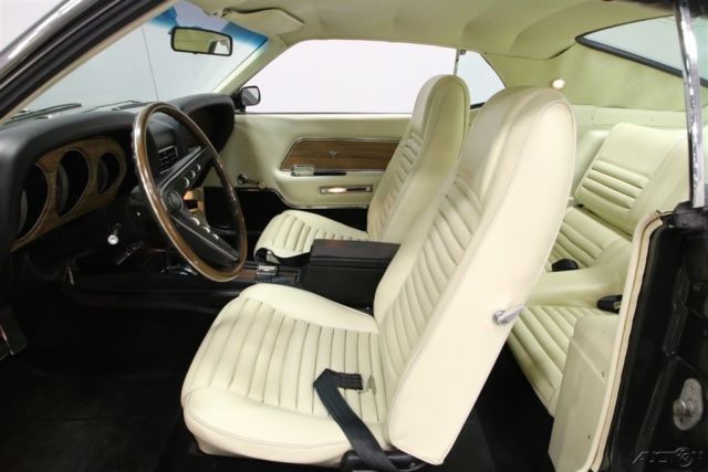 When you see a first-year Mach 1 with the big block Cobra Jet V8 and cold A/C, you know this car had to be painted green because of the all the envy it generates. So look over all the details on this 1969 Ford Mustang Mach 1 Cobra Jet, but just know it's a hot deal that will be going fast. The Mach 1 was the perfect canvas to showcase Ford's refreshed Mustang for 1969. The body was stretched to have a meaner street presence, and this new premium package was not shy about its prowess. The Mach 1s looked ready for the track with standard flat black hood paint to reduce glare for the driver. And the large front air dam and hood scoop are great aggressive additions. The Black Jade green paint is factory-correct, and it represents a great gloss and shine to highlight the Sportback body's excellent curves. Plus, the color has the perfect undertones to highlight the full yellow sports stripe package. Add in new chrome bumpers, bright trim, and GT wheels, and this is equal parts premium and performance. And that attitude is seen throughout this car. Ford was going upmarket with the Mustang at this time, and a great way to showcase that is with a pristine white interior. The doors, seats, and headliner all have an unmistakable look of premium. Plus, the woodgrain steering wheel matches the paneling on the dash, console, and doors, which all adds to the upscale ambiance of the Mach 1. In total, it looks like a time machine taking you back to 1969 â€" right down to the Philco radio that's still on display. And the factory feature we know will really make this a comfy cruiser is the cold-blowing air conditioning. While the interior is a bit of a coddler, the engine bay is filled with brute force. This is an Q-code Mustang, which means it had a 428 cubic-inch V8 under the hood when it left the San Jose factory. Today, this still has the oh so desirable 428 big block under the hood. Because while it has a correct presentation â€" right down to the decals on the bright air topper â€" beneath that is a Holley four-barrel carburetor allowing this big V8 to inhale even deeper. And while this has a terrific growl out of the quad-tip dual exhaust, don't let this beast fool you into thinking it cannot be tamed. With power steering, front disc brakes, and a three-speed automatic transmission, this big block Mach 1 is quite an easy cruiser. Complete with Marti Report, this is the ideal mix of premium, performance, and distinction. So if you want to have it all, hurry up and grab this deal. Call today!!!