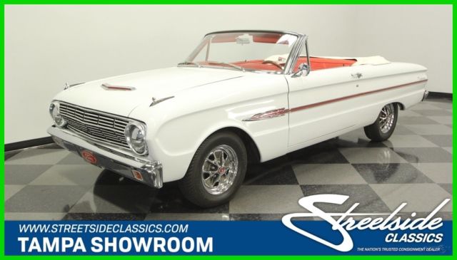 With its V8 power, four-on-the-floor, perfect color combination, and freshly restored condition, it's hard to beat this 1963 Ford Falcon Futura convertible for vintage top-down fun. And when you see the upgrades â€" from the larger motor to the A/C interior â€" you'll realize how irresistible this classic really is. The Ford Falcon is the car that fathered the Mustang, and now that it has matured into vintage status, you can really see the grown-up appeal on this convertible. This is especially true when the economy car roots are erased on the top of the line Furura trim. There's plenty of brightwork, including beautiful chrome bumpers, intricate grille, dual gunsight fender ornaments, and the afterburner-style tail lamps. And we especially love the arrow-like Futura side trim that seems to keep this convertible pointing forward. All of this shows exceptionally well against a recent professional application of the factory-correct Corinthian White. And while these are all terrifically correct pieces, there are some nice subtle upgrades. The half-chrome headlights and Mustang styled steel wheels hint at this droptop's performance upgrade. The white roof looks nice in place, but with the flip of a switch, it powers down to reveal a stellar red interior. Not only is this a terrific color against the white exterior, but also all the red exterior accents (including within the side trim and hood scoop) make this look like a highly coordinated package with the roof down. More than just a great color, they made some very cool investments in this Falcon. The seats are the rare split-bench w/armrest with a design inspired by the first years of the Ford Mustang. As you look across the dash, everything is correctly in place, right down to the working clock. But then you also sport some more upgrades like retro-style AM/FM radio with digital tuner, three-spoke sports steering wheel (original comes with the sale, too,) and there's a modern R134a air conditioning system to keep you cool with the top down long into the summer season. While you saw some Mustang-inspired touches inside and out, the best one is under the hood. This has been upgraded to Ford's 289 cubic-inch V8. More than just being larger than anything offered in for the Falcon in '63, this convertible has been further upgraded with a Holley four-barrel carburetor and Edelbrock intake. Plus, the dual exhaust has the sweet sound of power. So this Falcon can really fly, and you get full control of it all thanks to the four-speed manual transmission. And this restored classic also has thoughtful driving features like power steering and power brakes with front discs. There's even aluminum radiator so you can run cool even in traffic with the A/C pumping. Complete with maintenance records, this is a very thoughtful restoration of a terrific vintage convertible. Complete classics like this are a rare sight, so don't miss your chance. Call today!!!