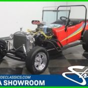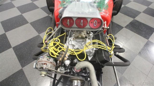 Like it or not, the T-Bucket is back in a big way. There's surely a reason why we can't keep them in stock, and when they're as nice as this 1923 T, we're quite certain one of you traditional hot rod guys will grab this one up in the next few weeks, too. The look is perhaps the most instantly-recognizable hot-rod of all time, equal parts cartoon and serious performance threat, and the abbreviated Model T roadster pickup body has a few styling cues to let you know its origins. Painted in bright red with cool vintage '70s airbrush work, this one stands out simply because it looks like it was there when it all started. The paint shines reasonably well and while it's not show-quality, it's quite presentable and does nothing to diminish the fun that the T-bucket represents. It's got a clean, simple, no-nonsense look, as if the essence of the minimalist T-bucket was bared down even farther, leaving just the basics. You'll note the front end was stretched a bit to handle the big block Chrysler V8 and there's a familiar Model T radiator shell out front. Out back, the abbreviated pickup "bed" has been finished with a pseudo tonneau cover, and the mural back there is a familiar glimpse into what makes this hobby so great. The interior is, of course, minimalist, but the black pleated vinyl is durable enough to survive out in the elements. I suppose it's technically a bench, but it, too, is minimalist, and you'll have to brace yourself to stay planted behind the Grant GT 4-spoke steering wheel. A full complement of instruments in the dashboard show you what's going on up front (well, the things you can't see, anyway), and a slightly raked column makes for a far more comfortable driving position than most T-buckets. You'll also spot a driver's door, which makes getting in a lot easier than most Ts and even the stripes wrap into the jambs, so this paint job wasn't a cheap one back in the day. There is no stareo to overcome the side pipes so you'll have to get used to running alfresco and there is no top. That's the T-bucket way. A 440 cubic inch Chrysler V8 provides motive power, and since it's out in the open like that, the 440 is dressed up for show. Finned Mickey Thompson valve covers are a traditional touch matched by a towering scoop-style air cleaner and a block painted black to match the chassis, so it blends right in. There's a mild cam inside, an Holley 4-barrel carburetor and Edelbrock intake, and those long-tube headers and side pipes that are part of the T's DNA, so it runs well enough to need all that rubber out back. A quick-shifting TorqueFlite 3-speed automatic drives a narrowed Ford 9-inch rear end, which shrugs off the big block's torque. The front suspension uses a dropped I-beam front axle and a leaf spring to hang it waaaay out there, giving the T a rather sleek look. Shiny Cragar mag wheels look vintage and wear traditional skinnies up front and giant track-style meats out back. Hot rodding has evolved, but the T-bucket remains a constant. Perhaps that's why people like them so much. At the very least, I can guarantee this one will always put a smile on your face. Call today!