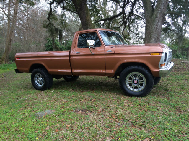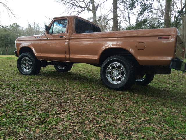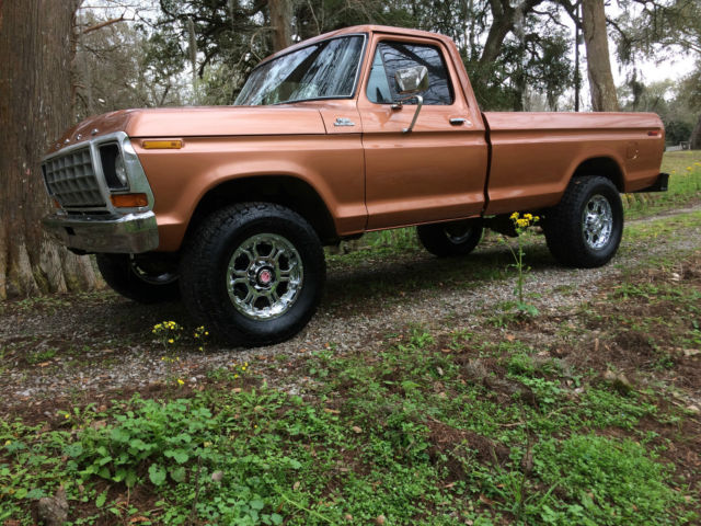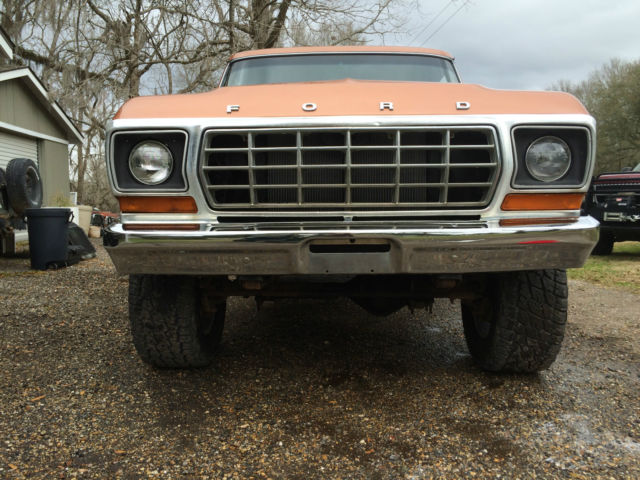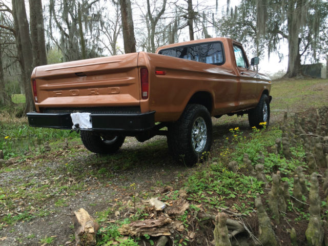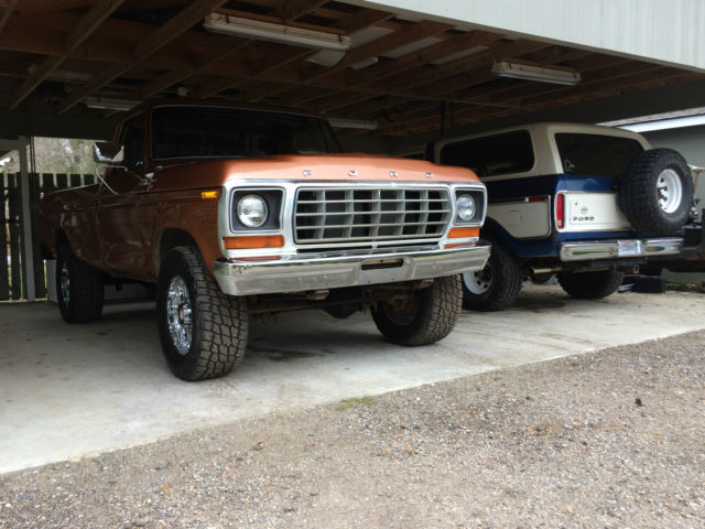 | 1978 Ford F-250 4x4. Truck is a daily driver with new brakes including calipers and hydraulic lines and brand new Nitto Terra Grappler tires. Paint is Harley Davidson anniversary copper metallic. It is cracked and beginning to bubble in several spots with one chipped spot on the hood but still shows very well. New CD player and door speakers. 400 motor. all stock with automatic transmission and part time transfer case. Shifts fine through all gears and 4 wheel drive works great. Body is straight and solid with the only patched metal being on the drivers side floor pan. Starts right up and runs very good. Tracks very straight down the road at highway speeds (even on south Louisiana roads). Non A/C truck. Heater works well. Has the original spare tire mounted under the truck. On Mar-01-15 at 20:00:44 PST. seller added the following information:Walk around and drive video on YouTube under "1979 FORD F-250 Pickup Truck" (accidentally put the wrong year in the video description). Also has new aluminum radiator. |