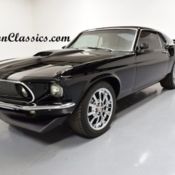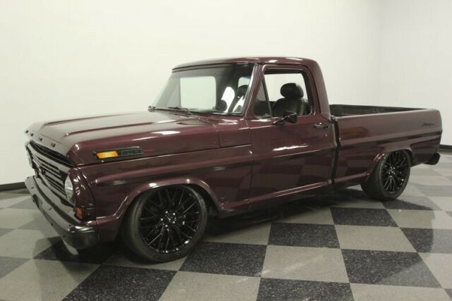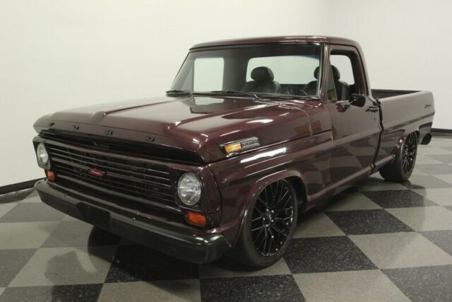 While we bet you stopped to look at this 1969 Ford F-100 Ranger because it has a slick and mean look. But as you dig just a little deeper, you're going to find a restomod with all the right pieces that back up this attitude. This includes an upgraded suspension, custom A/C interior, four-wheel disc brakes, a six-speed stick shift, and a modern Coyote 5.0-liter V8 heart. Trucks from this era are always a great part of... nostalgia because they remind us of a hard day's work. So when you combine it with the full dark treatment, this Ford looks like it apprenticed with the grim reaper. The Black Cherry paint looks dark as midnight until the sunlight hits it, and then some deep red tones start to come out. That's when you really see the difference with the black trim and bumpers. And as you look in the truck bed, it not only has tough black liner paint, but also you'll spot the custom contours that hint at the upgrades installed in the suspension (more on that in a moment.) Of course, the real tip-off for the serious performance upgrades come from the modern 19-inch Mustang black alloys on the lowered suspension. Inside the dark theme continues, but with a premium twist. The seats are comfortable modern buckets finished in a supple leather. They even power adjust to your ideal position. There's also an AM/FM/CD stereo upgrade and cold-blowing R134a air conditioning. But this truck is more than just comfortable. The tall Hurst shifter, grippy sports steering wheel, and Mustang gauges set behind the original panel are more hints at the performance heart. We often see engine upgrades in these classic Ford F-Series pickups, but nothing as cool as this. You're going to love lifting the hood at car shows and seeing jaws drop when people spot the 5.0-liter Coyote. This is such a modern fuel-injected motor, that you still get a similar V8 in a brand new Mustang GT today! Not only is this a serious powerplant, but it gets to announce itself with authority thanks to the BBK headers that feed the dual exhaust. You're in complete control of this modern V8 and its rumbling soundtrack thanks to the six-speed manual transmission. And because this truck has the power to be a true street machine, they upgraded the suspension to really be best on the streets. That means a full Crown Vic suspension upgrade, power steering, sway bars front & rear, four-wheel disc brakes, and grippy Michelin Pilot Sport tires. This is an outstanding classic with a modern performance heart. And while it looks mean, it's oh so nice to drive. That makes it an impressive total package that's ready to run right now. Call today!!!