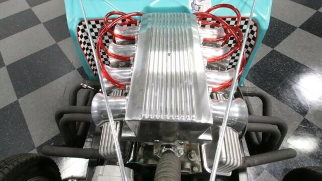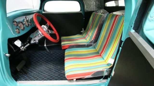 This 1934 Ford coupe has a little something for everyone. It's a little bit familiar but isn't a slave to tradition, and packs a potent 350 cubic inch V8 that makes it more than just pretty. Neat tricks abound, making this the rod for people who appreciate innovation and craftsmanship as much as loud engines and horsepower. If you squint, you can see an early gasser profile in this sleek coupe's DNA. Then again, the '34 is... a totally fantastic design and they took advantage of its many unique features to create this awesome rod. Up front there's the traditional heart-shaped grille which is still one of the finest designs of the '30s, and it's been raked back a bit to help with the sleek profile. Stripping it of its fenders and hood gives it a bare-knuckle look that's very appealing and with the bright turquoise paint and traditional pinstripe work, it's anything but subtle. Fortunately, this high-impact rod has the build quality to back up the eyeball-searing paint, because it cackles and snarls and the nose-up profile screams, "Let's race!" The open engine bay shows off the hardware and when you look close you'll find details like the trick gas tank that's integrated into the body lines, Pontiac taillights with blue-dot lenses, and a perfect chop. This rod does a lot of things exactly right. The interior is definitely primitive, with aluminum racing bucket seats wrapped in playful patio furniture pads with bright upholstery. Plain door panels continue the no-nonsense theme and the carpet adds to the fun. A full array of cream-colored Shark gauges fit in the dash and the red leather steering wheel just looks too cool in the turquoise passenger compartment. This car is obviously all about fun. You'll dig the 8-ball shifter, you'll appreciate the tilt steering column, and there's enough room for even tall drivers. And yes, this is a practical rod, too, because there's a good-sized trunk out back that's nicely upholstered and includes the remote-mounted battery. The engine is a 350 cubic inch V8 crate motor that's a few years old. Being exposed like that means it has to look good as well as go like stink, so they dressed it up with finned valve covers, a checkerboard pattern on the firewall, and that trick air cleaner that looks like a vintage injection system. Horsepower is enhanced by a big Edelbrock 4-barrel carburetor and intake underneath that trick air cleaner and a pretty decent cam inside. An aluminum radiator keeps things nice and cool and with those headers and side pipes, it sounds like the 1950s all over again. The transmission is a TH350 3-speed automatic, so this '34 can cruise effortlessly at highway speeds and actually pulls down decent fuel economy while doing it. The chassis features a Vega steering box, front disc brakes on a Speedway dropped front axle, and a Ford 8-inch rear end on coil-overs and trailing arms. Slick sand cast aluminum wheels give it that old-school stance and are wrapped in 195R15 skinnies up front and fat 27.5x11x15 McCreary cheater slicks out back. This is another one of those cool rods that couldn't possibly be duplicated for the asking price. If you like the minimalist look, you'll be delighted with the surprises inside. Call today!