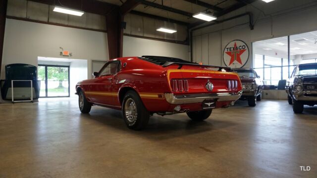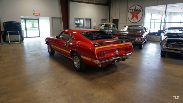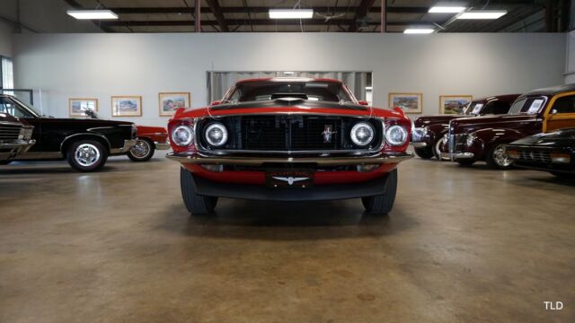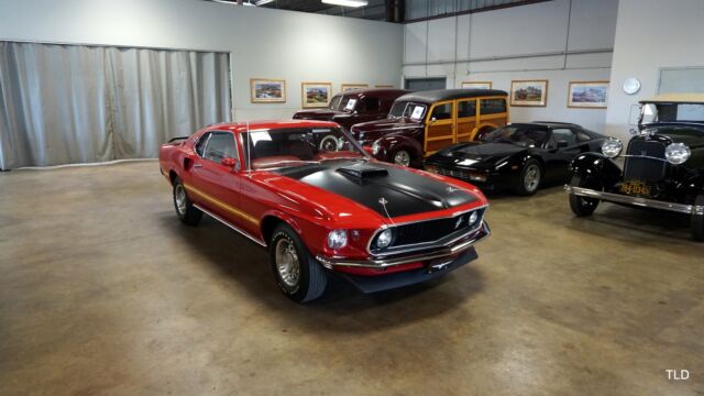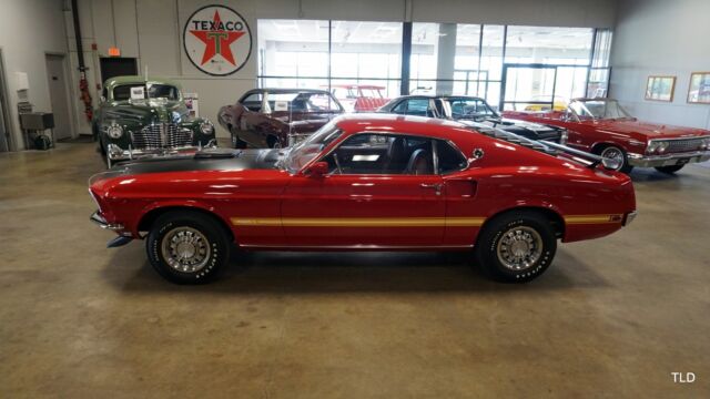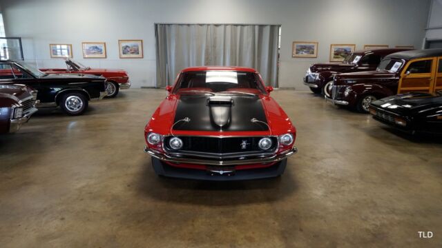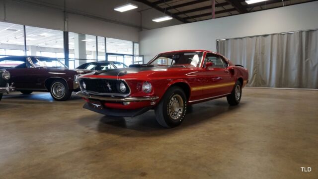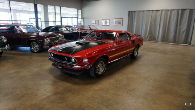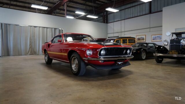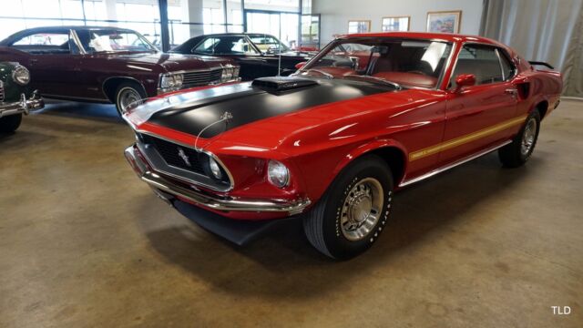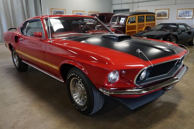 428 Ram Air Super Cobra JetFactory Correct Candy Apple Red with Blackout Hood TreatmentDark Red Clarion-Knit Vinyl High-Back Bucket SeatsDocumented with 4 Build SheetsExceptional Concours-Level Frame-Off Restoration by Marque Specialists Using Mostly Original Equipment and ComponentsOriginal Engine and TransmissionFactory Drag Pack with Close Ratio 4-Speed Manual Transmission All the right Mustang muscle-car buzzwords can be used to describe this 1969 model: Mach 1, R-code, Super Cobra Jet, Shaker and Drag Pack.... Rare to begin with as one of very few Mach 1s built with the ram-air 428 Super Cobra Jet, close-ratio 4-speed manual transmission and 4.30 Traction-Lok rear axle, the SportsRoof is made even rarer by its Candy Apple Red paint and Dark Red interior-in fact, only 33 were produced with these engine and trim options. According to the Marti Report, only five other 1969 Mach 1s were equipped the same. Deservedly, the red-on-red Mach 1 has completed an exceptional, concours-level restoration by Marque specialists using mostly original equipment and components, right down to the markings beneath the hood and factory styled wheels with Goodyear Polyglas tires. With the R-code 428 Cobra Jet, the Mach 1 came from the factory with the functional Shaker hood scoop that crammed cooler outside air into the 335 HP engine under full throttle. When ordered with the optional 4.30 rear gears, the 428 was upgraded to a Super Cobra Jet at the factory by adding an oil cooler, heavy-duty connection rods and special balancing. The SportsRoof-only body style added plenty of supercar image with the blackout hood, cable-attached click-pins, gold reflective strips, dual racing mirrors, quad exhaust tips and a unique interior with Clarion-knit high-black bucket seats, molded door panels, console, wood-grain trim and passenger-side clock. Sold new at Marshall Motor Company in Mayfield Heights, Ohio, the Super Cobra Jet Mach 1 retains its original engine and transmission and is documented by a Deluxe Marti Report, four build sheets and a quality checklist. Additional factory options include power front disc brakes and an AM Radio. The popular front spoiler, rear wing and rear window slats have also been added.