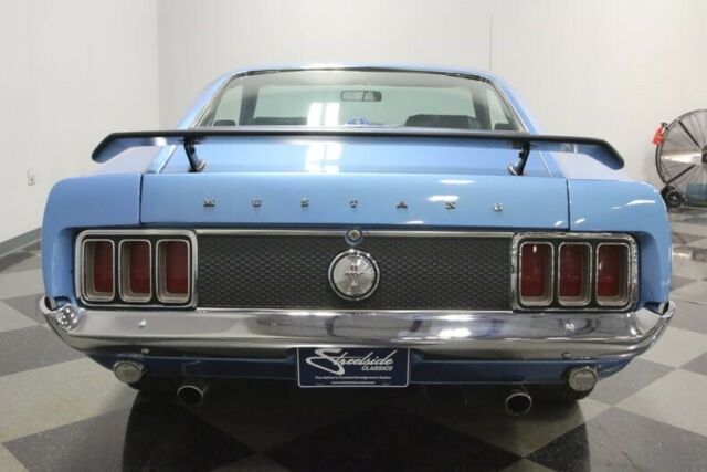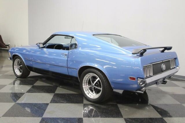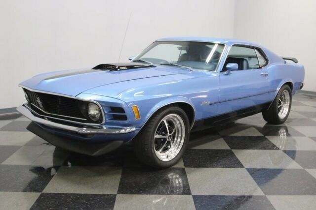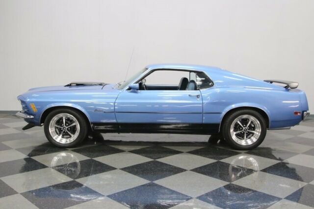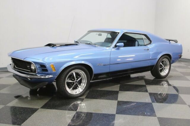 This 1970 Mustang sportsroof is proof that you don't need to spend a fortune to own a cool Mustang. With a snappy 302 under the hood, a great color combination, and a few Mach 1 touches, it has the look everyone is paying big money to own, all for a bargain price. If everyone made a list of the top 10 best-looking muscle cars of all time, the 1970 Ford Mustang fastback would probably be on a... majority of those lists. This is one great-looking car. Finished in Medium Blue Metallic with black stripes, it's a classic look that worked on cars like the Boss 302 and Mach 1, and it works equally well here. A custom hood scoop, chin spoiler, and a decklid wing all make this car look seriously fast, and the paint job ties it all together quite nicely. This isn't some patched-together car, it's a solid, clean southern Mustang with straight sheetmetal, all refinished by guys who made sure it looked right. Sure, it's got a few signs of use, a few nicks here and there, but none of it is visible from behind the wheel or on the roll. You'll also dig the blacked-out grille and honeycomb tail panel, period details that work extremely well here. The blue interior is almost entirely new, starting with fresh seat covers and new foam on the original buckets to make the all-day comfortable. The carpets are in great shape with only light wear, the door panels still fit tightly, and the dash pad looks great. The center console houses a familiar T-handle shifter, which now manages an AOD 4-speed automatic transmission, and there's a new AM/FM stereo that powers speakers throughout the interior. The original gauges have been replaced by a set of cool Dakota Digital dials that work rather well with the new blue LED lighting under the dash. The trunk is nicely finished with a correct mat set, which also includes a cover for the spare tire. Ford's 302 cubic inch V8 has to be one of the best engines of the past few decades. Light, torquey, and virtually bulletproof, it can be built to build big power in a compact package, just as it has been in this car. With a Comp Cams camshaft, valves, and springs inside, an Edelbrock intake with a Holley double-pumper on top, and long-tube headers, it has the right parts to make horsepower. Externally, it looks great with Ford Blue paint, shiny aluminum valve covers, and practical details like a big radiator up front. Monte Carlo bars strengthen the front suspension, and the lowered stance definitely helps improve handling. The 4-speed automatic transmission is linked to a 9-inch rear, and the suspension was fully rebuilt with new front control arms, KYB shocks, subframe connectors, and fresh polyurethane bushings. Flowmaster mufflers sound fantastic, with a snarl that will make the hair on your neck stand up, and those trick 17-inch Magnum 500 wheels carry 245/45/17s up front and 255/45/17 Nitto radials out back. If you like the bad boy Mustang look, this is a fantastic way to get it without spending a fortune. Call now!