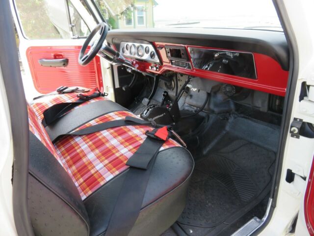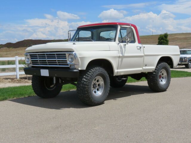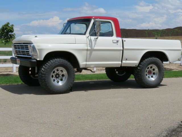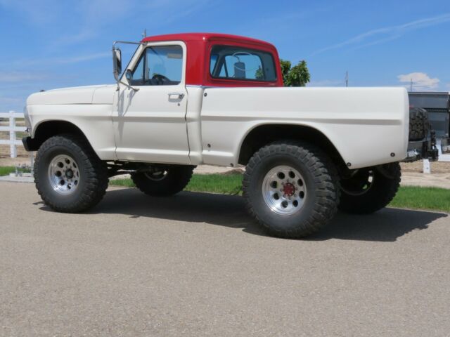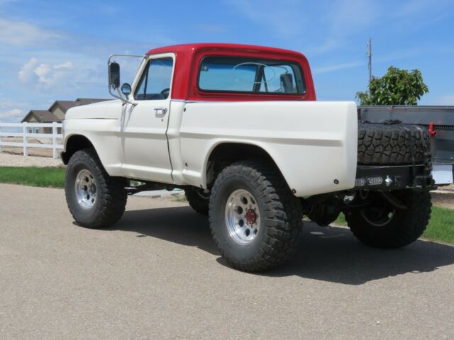 1971 Ford F-250 Custom short bed 3/4 ton 8-Lug. Paint:* Lipstick Red over Wimbledom White. Drivetrain:* Dana 60 rear (new drum brakes and drums).* C-6 auto trans (HD rebuilt with shift kit).* Twin I beam front end all gone through new kingpins, bushings, bearings, disc brakes and rotors, new double shocked front.* Built FE390, RV cam, Edelbrock manifold and carburetor.* New headers 3" out.* new exhaust is (2) 3" into (1) flowmaster and 3-1/2" out.* New 3row High efficiency radiator with electric fans. Body:* Very awesome looking truck. It gets a lot of attention.* Fiberglass hood, Bulged Fiberglass fenders front and bedsides.* It is always parked in either the shop or garage all the time. Undercarriage:* Very clean for this off road truck. NO rust in any sheet metal. Idaho is a non salt state but the truck has not driven in winter.* Frame and sub frame is really clean. This frame was shorted from 131" wheel base down to 115" wheel base (short bed) by a well know custom off road shop.* Rear shocks are new and the top mount is a new custom mount (pointed to the front)* Steps were made to inter the cab, and there removeable with (1) bolt on each side. Interior:* Rolled on bed liner on floor.* VERY CLEAN.* The dash is painted red (same as the top) gauge cluster is billet with new digital gauges.* New windshield and back glass both with new rubbers, side glass were good just replaced rubber belts and felts.* Headliner is Black Ostrich as well as sun visors, also a back panel with Black Ostrich was made for where the gas tank was taken out.* Brake controller, fuel level and volt gauge are mounted under the dash. Aftermarket additions:* New custom bench seat in Plaid and Black ostrich in awesome condition.* Heavy duty power steering (police gears quick lock to lock). * No sound system (1 new two sided speaker through top of dash).* the gas tank behind the seat was taken out and a tool box / tank combo (63gal.) tank was put in the front of the bed.* Bed has steel floor with B&W gooseneck removable 2-5/16" ball welded and braced into it. There is 48"+ in between the wheel wells.* Class 5 hitch welded into bumper, 7way plugs in the bed and on the rear bumper.* Storage compartment under the spare tire with (2) quick quarter turn fasteners.* Headlights are vintage old school Cibie H4. The truck sits on BFG's Mud Terrain Km2 38 X 14.5 R17LT. The spare is a 37 X 12.5 R17 LT, 17" Pro Comp wheels for all (5). This truck began life as a "camper special" model, I started this build Nov. 2014 and so its all been gone through and I loved building it and love driving itin the warm weather and hate to see it go but I need the garage space. Clean and clear Idaho title. No accident history. Truck is located in Nampa, ID. 83686. As far as shipping goes you are responsible, but I will assist you if I can and will hold the truck, which would be in my secure garage until you transport, for up to 30 days. Remember! feel free to ask questions and please understand that this is an (as is) purchase and all sales are final. That being said this truck is beautiful and will last you a very long time should you love it like I have. Message me your first name and number before you buy or offer, and I will send you any other info you need or I can call you to discuss this sale. |