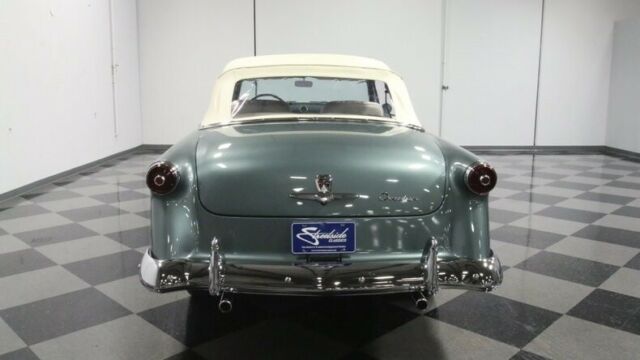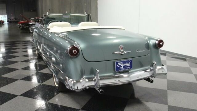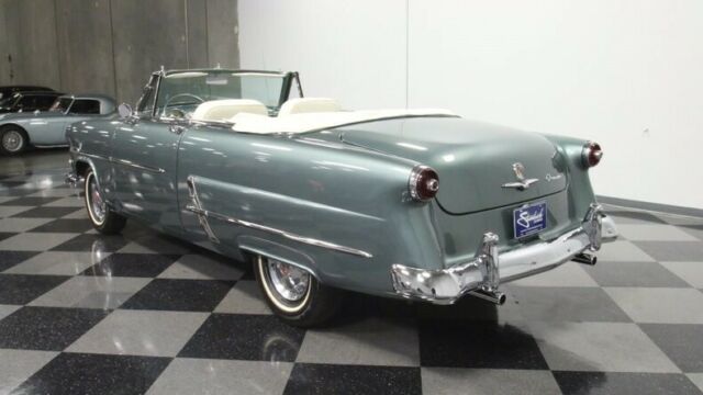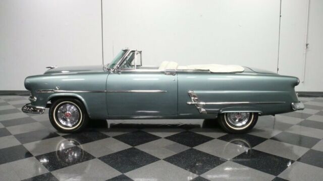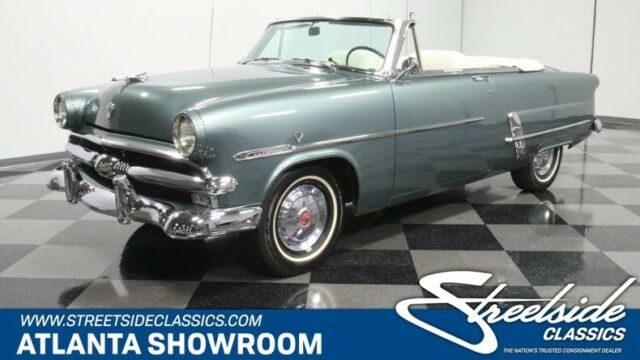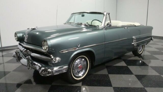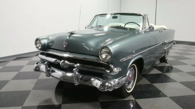Some 50 years after the first Ford rolled out of its Mack Avenue, Detroit plant, this 1953 Ford Sunliner Convertible emerged, stylistically bridging the gap between the boundless curvature of the models before it and the more squared off appearances of those to follow. This is a coveted classic seldom seen on the road, and it pairs its outstanding aesthetics with a more modern engine under its hood for more power and increased reliability. The entire... Sunliner line got a freshening the year before this '53 first set rubber to road, including a more modern wrap around windshield for increased visibility. Thoroughly revitalized and wearing a coat of green that nicely accentuates its form, this vintage Ford cuts quite an appearance and it's pretty easy to see why it was called upon to pace the Indy 500 field the year it debuted - with William Clay Ford behind the wheel, no less. There's a world class display of chrome featured on the exterior that includes a signature bullet sitting at the center of a beefy front grille and bumper, as well as prominent side trim and awesome accenting adjacent to the skirted rear wheels. The paint itself is in fine shape - it's a very distinctive shade and holds a nice, deep shine and a smooth texture. Neatly tucked beneath the tonneau cover in back sits a white convertible top that's ready to rise up for protection in the event of darkening skies. This vintage Ford features a great looking interior. The pair of white leather bucket seats at its center were originally from a Lincoln and fit nicely in this setting, with door panels to each side and quarter trim in back featuring period appropriate tuck and roll surfaces. A plush center console sits between the buckets, offering additional interior storage space. The dash area remains in largely original configuration and it's looking as clean as can be, with its fan shaped instrument cluster clear and readable, an analog clock that actually works, and all switches and control knobs securely in place. The original AM radio is still positioned at the center of the dash, but there's also an AM/FM/Cassette stereo mounted in the glove box to provide an enhanced audio soundtrack while you're on the road. Air conditioning is a welcome feature not often found on classic convertibles of this era and it's blowing cold and strong. The spacious trunk area is well prepped and harbors a full-size spare inside. In place of the original vintage engine, a 302 cubic inch V8 now sits beneath the hood, surrounded by cleanly painted inner fenders and a matte black fire wall, wearing a blue-tinged, open element air cleaner and surrounded by fresh plug wires. It was only recently rebuilt, so it's running in top form, and pairs with a 4 speed automatic transmission whose overdrive gear provides low RPM cruising at highway speeds. Farther forward, there's a sizable aluminum radiator on board to help keep engine temperatures under control during more demanding driving conditions. This pivotal classic rides on a set of 15" wheels with chrome hub cabs wearing 6.70-15 whitewall tires to top off its thoroughly authentic appearance. A glance below will reveal an undercarriage that's in impressively solid shape and from that vantage point you can see the X bracing Ford employed to maximize structural rigidity. Rarely encountered and endlessly impressive, this 1953 Ford Sunliner Convertible is a skillfully restored classic that features a number of well-chosen upgrades to make for a fine vintage driving experience. Call today!