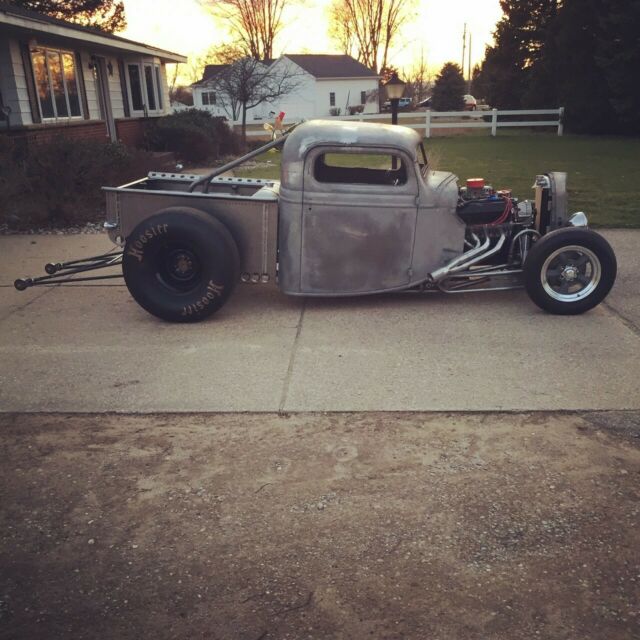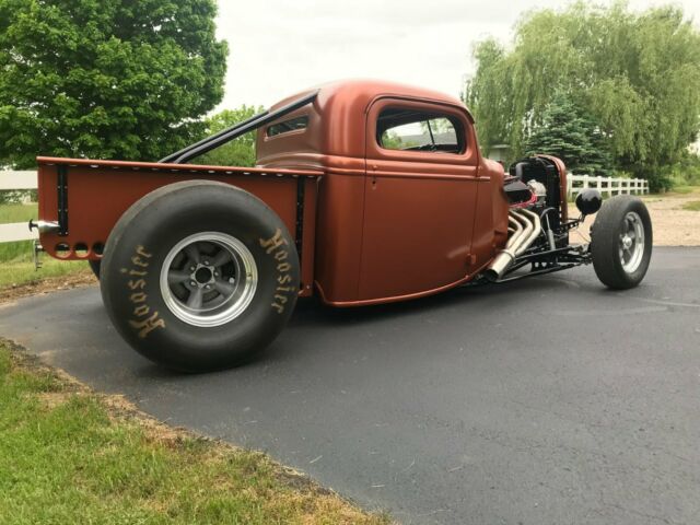 1937 Ford Truck Body: • Chopped 6.25†... • Custom built bed. Bed is removable for chassis access. • 1934 Chevrolet grilled. Filled, with custom stainless insert. • Aluminum top fuel style escape hatch with hartwell latches. • Burnt orange metallic paint Chassis: • Main Chassis rails are double stacked 1.625" dom tubing. • 10 point roll cage (1.625" dom). NHRA 8.50 cert rules were strictly followed. • Removable swing out door bars. • Entire chassis is ultra high gloss black powdercoat Front suspension: • 4" forged, drilled front axle (powedercoated) • Custom front radius rods (1.25â€x.120 wall) (powedercoated) • 1937 ford spindles with GM style disc brake setup • Vega steering box • 3 way adjustable comp. engineering shocks Rear Suspension • 1959 ford F100 9" housing (stamped 2 piece .250" thick housing) (powedercoated) • Curries Center section • 4.56" gears • Detroit Locker • 31 spline 4140 axles • Disc brake conversion kit w/ gm metric calipers • Custom rear ladder bars (1.25" x .120" wall) (powedercoated) • Aldan double adjustable coilovers • Custom adjustable Anti-sway bar (powedercoated) • S&W 48" wheelie bars (powedercoated) Interior • Wilwood dual master "swing style" pedal assembly • Mechanical line lock • Winters side winder shifter in custom aluminum mount • Kirkey 55 series seats • Aluminum steering wheel Wheels/tires • 15x4 torq thrust II front wheels w/front runner tires • 15x10 torq thrust II rear wheels with 33x10.5W rear tires Engine: • Ford 351w .030" over • DSS forged flat top pistons • "Truck" Rods shot peened w/ arp bolts • Extensively Lightened and knife edged crankshaft • AFR 205 renegade heads • Bullet custom hydraulic roller cam • Roller rockers • Edelbrock victor intake • AED 950 carb • Adjustable 125-250 hp nitrous plate • Custom built stainless 1.875-2" step tube headers with custom removable stainless bullet mufflers • Front and rear aluminum mid plate mounts • Aluminum 3 pass radiator/ 1600 cfm electric fan • MSD 6AL2 programmable ignition system Transmission • Ford C4 • Rollerized, 5 forward drums, trans brake • SFI approved aluminum bellhousing • SfI approved flexplate • Broader performance 3500 stall convertor with anti-ballooning plate • Large Derale rear mounted cooler with electric fan • Aluminum driveshaft