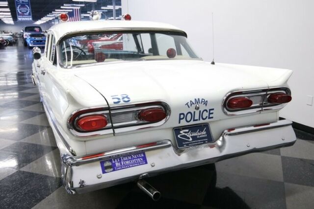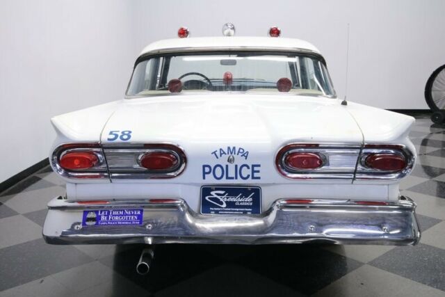This is the car for those who wants a bit of fun with their classics. After all, a 1958 Ford Custom 300 dressed in full Tampa Police livery is the kind of car that's going to get you invited to everything from parades to charity events. This one is believed to be a true Tampa Police cruiser, which is always cool. Even without that, a '58 Ford is already a pretty desirable car. After all, it's the best... in post-war styling with wraparound chrome bumpers, an extra wide grille, jet-inspired taillights, and a wraparound windshield & back window. Plus, you'll love the details like the full-length trim line with artful design on the rear doors. And only heightening this vintage appeal is the police livery. Proper decals on the doors, a spotlight, and three red lights on top all remind you of a time when solving a crime meant returning a homemade pie. And nothing beats the sound of the old-school mechanical siren. Inside, you have great-looking two-tone door panels, new headliner, and two rows of bench seats with comfy cloth inserts. So we doubt you'll be carting around any offenders in the back, but this full-sized Ford has plenty of room to carry family and friends when it's parade time. It's a little hard not to feel like Barney Fife the moment you slip behind the classic Ford steering wheel and gaze at all the classic police pieces, like the two-way radio and handcuffs. Under the hood, this one looks ready for police business. This Ford 292 cubic-inch motor means you have V8 power to chase down trouble and push it out of town. You'll love details, like the blue accents and the "Interceptor Special" badging on the air topper. This is even believed to be the original motor to the car. The V8 fires up and runs with the kind of eagerness that it's ready to serve its community. Plus, power steering and the column-shifted three-speed automatic transmission give you proper control. The sale comes with a shop manual and even a Tampa police code book. You're not the only one who is tempted by this Ford's authority, so hurry up and call today!